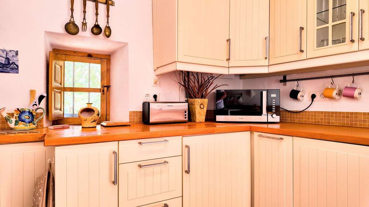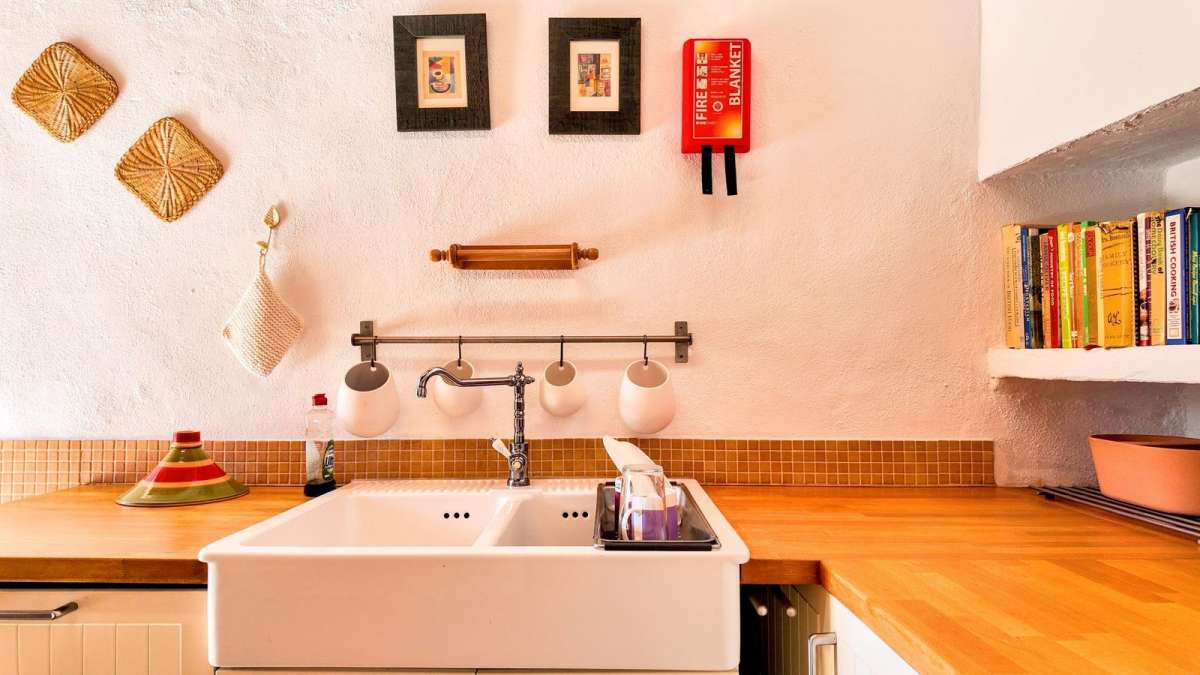 The living area is bright and inviting, with a cozy sitting area, dining space, and a charming stove and fireplace to create a warm atmosphere. The fully equipped kitchen includes a stove, dishwasher, and two refrigerators, with a door leading directly outside for easy access to the outdoors.