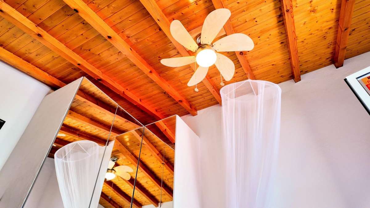 The bathroom is fitted with a bath, shower, sink, and toilet, providing a comfortable and functional space. There is no air conditioning in the living room, but the upstairs bedrooms are equipped with air conditioning for added comfort.