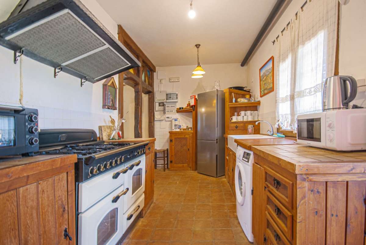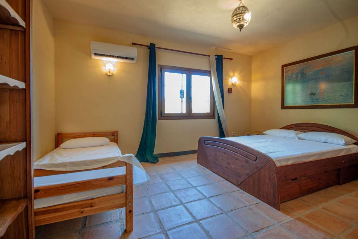 The home is south-facing, ensuring plenty of natural light throughout the day, and features air conditioning (both hot and cold) for year-round comfort. The highlight of the outdoor space is a large private pool, perfect for cooling off in the summer or enjoying long, relaxing days in the sun. A covered terrace offers shade and a peaceful setting for outdoor dining and entertaining.