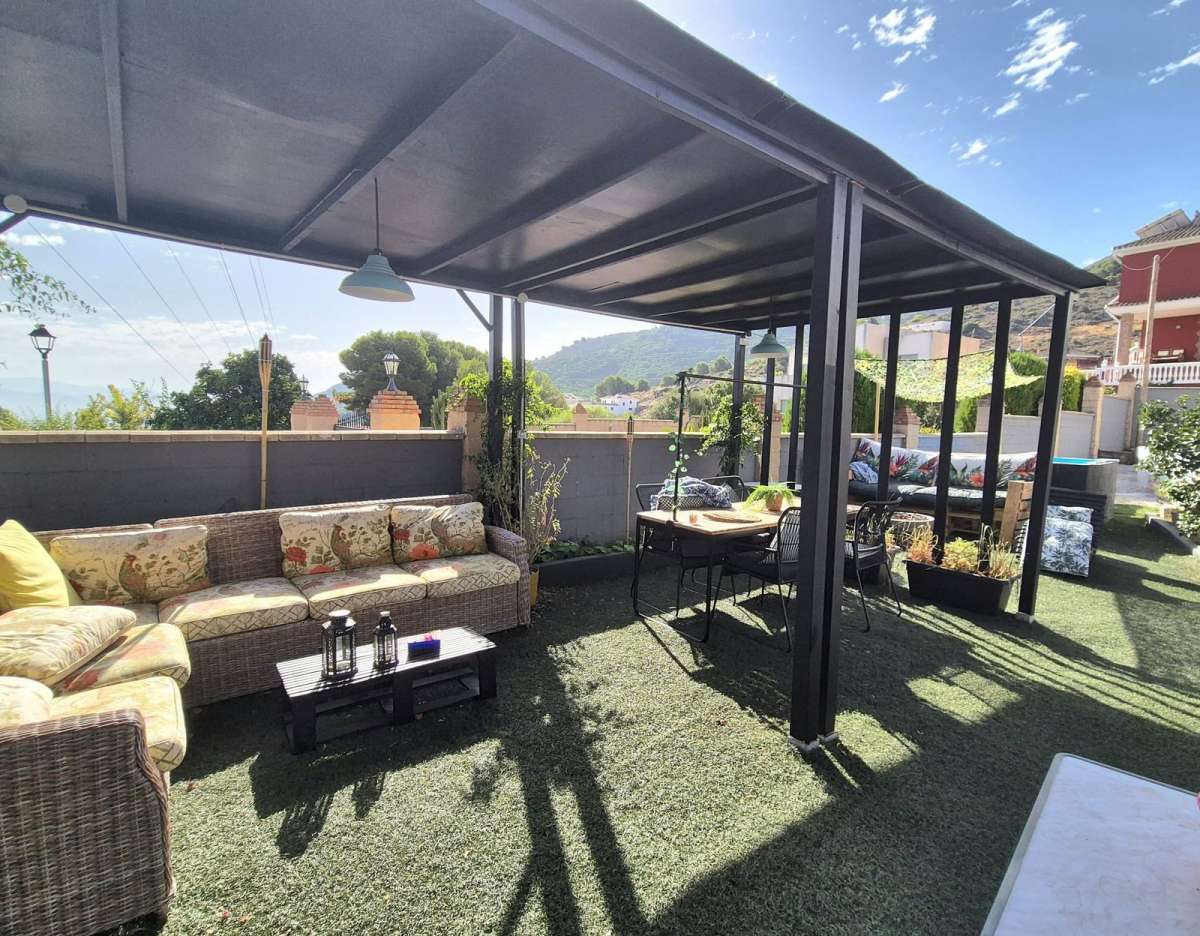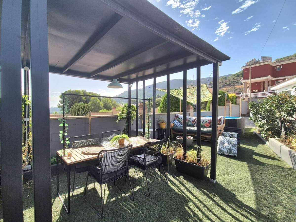 The property is located near the top of the urbanisation. You can enter the property which is fully fenced, either by a portal door or sliding electric gates, you have plenty of parking for at least 5 cars. You have several sitting areas and different spaces on the land to use as you wish and all mostly flat. To the left of the property you have a nice seating area with pergolas and outside kitchen with nice views to the valley and a small plunge pool. There are two entrances into the property, the main front door and a back entrance from the parking area into the hallway / kitchen.