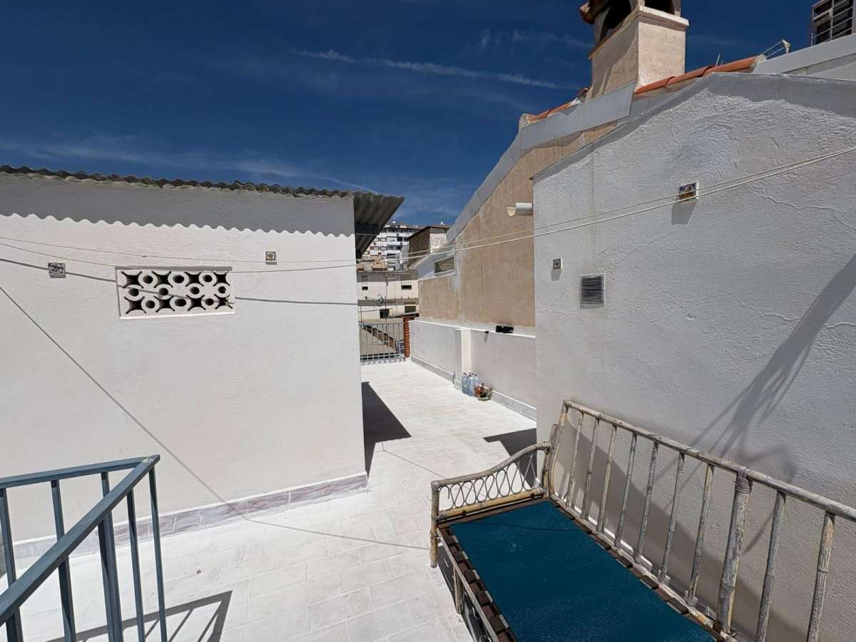 The property is distributed over two floors plus a spacious rooftop terrace. On the ground floor, you'll find one bedroom, a small bathroom, a cozy living room, and a functional kitchen with access to a small patio. The second floor features two bright bedrooms and a full bathroom. The terrace, approximately 45 m², includes a laundry room and boasts beautiful sea views, making it the perfect space to relax, enjoy outdoor dining, or create a chill-out area.