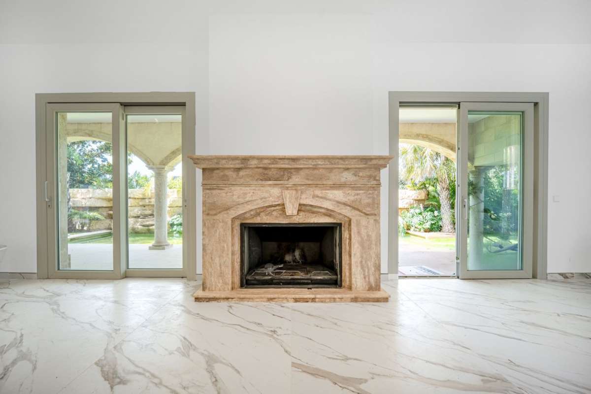 In the main living room, a grand open fireplace creates a cosy and inviting atmosphere. Step outside, and the space becomes even more special. The garden is surrounded by tall palm trees, providing privacy and a true sense of escape. The centrepiece of the garden is the private pool. It features four gentle waterfalls, creating a calming, almost spa-like feel. Along one side of the villa, a fishlake adds to the peaceful setting, and beside it, a terrace with an open wood-burning barbecue under arched stonework is perfect for outdoor meals or entertaining. On the far end of the garden, an old property was removed to extend the garden, adding to the villa’s sense of space and privacy.