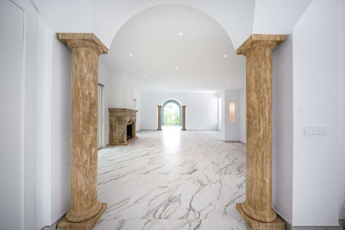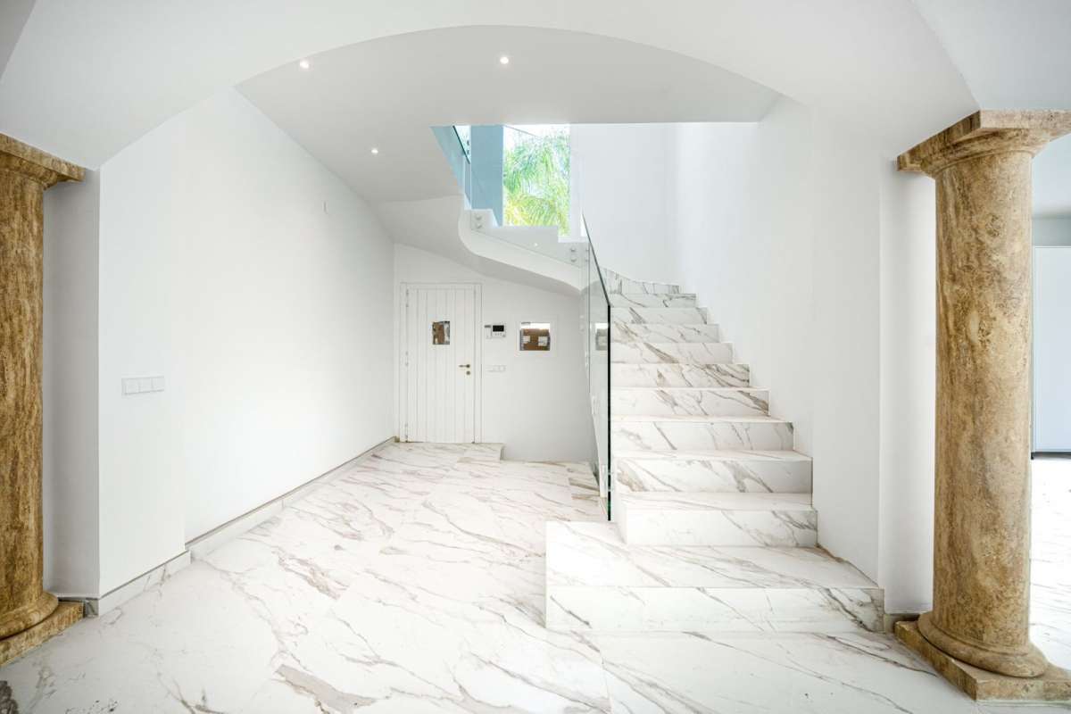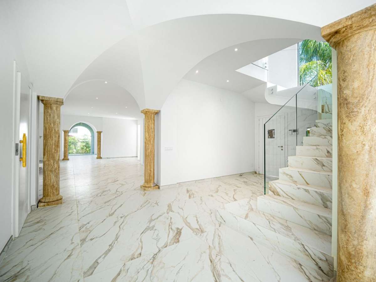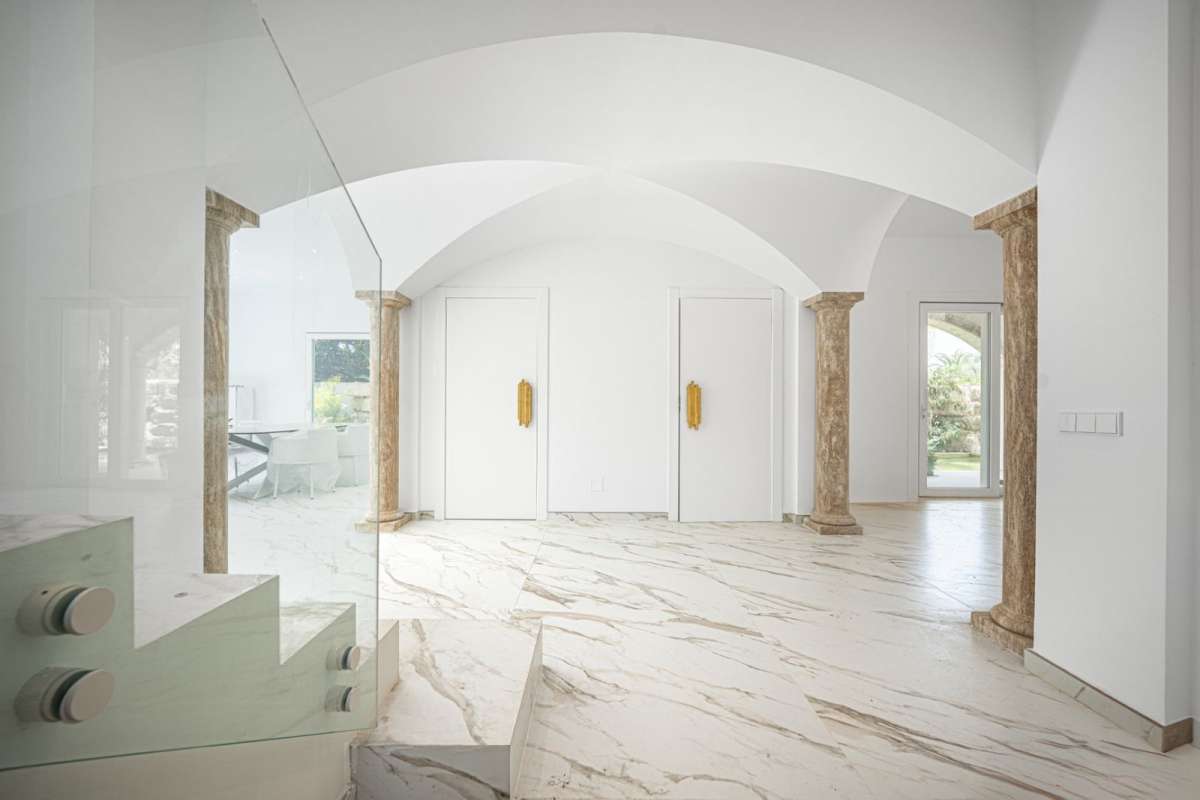Tucked away in the exclusive beachside area of Los Monteros in Marbella East, just a short walk from the beach, this villa is truly one of a kind. Inspired by Venetian church architecture, it combines timeless European elegance with relaxed coastal living. Set on a generous 933 square metre plot, the four-bedroom, four-bathroom home—including two en-suites—is spread across three levels, offering a unique blend of style, comfort, and space. A grand entrance welcomes you with elegant pillars, arched doorways, and polished marble floors that run throughout the house, setting the tone for what’s to come.