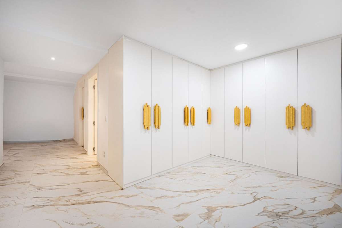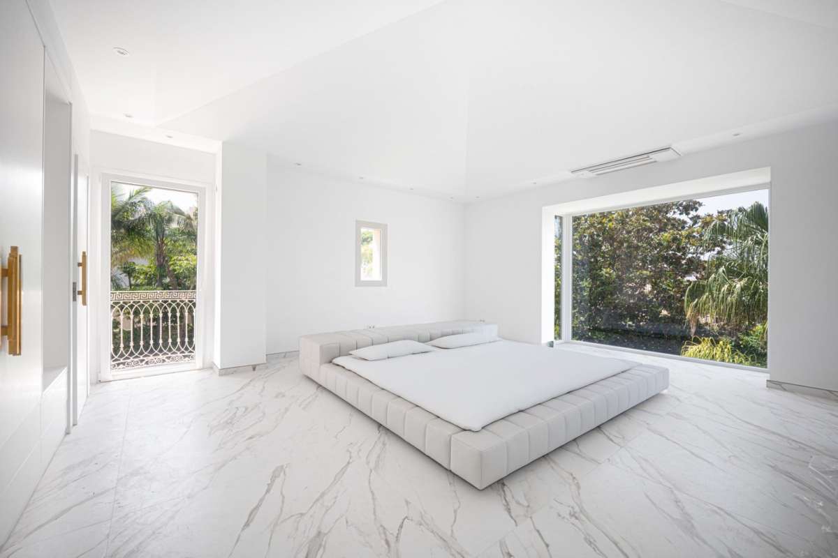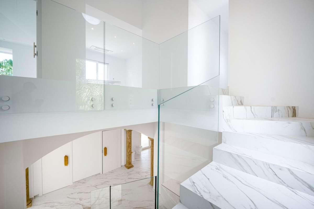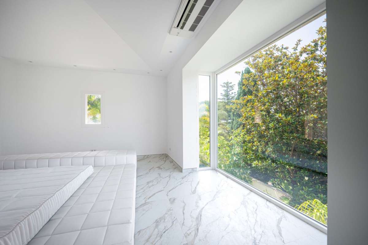 A glass balustrade staircase leads to the upper floors, where a domed ceiling casts soft natural light across the hallway. Each bedroom has floor-to-ceiling windows that flood the rooms with light, thanks to the southeast-facing orientation. The master suite is a peaceful retreat with a large walk-in dressing room featuring a central island, and a Juliet balcony that overlooks the private pool. On the lower level, there’s a flexible extra room that could serve as a gym, cinema room, or a private guest apartment, giving you the ability to customise the home, to suit your lifestyle.