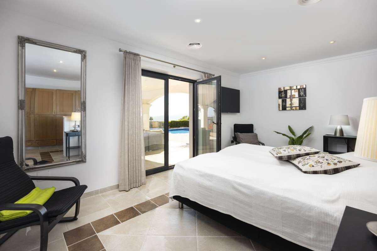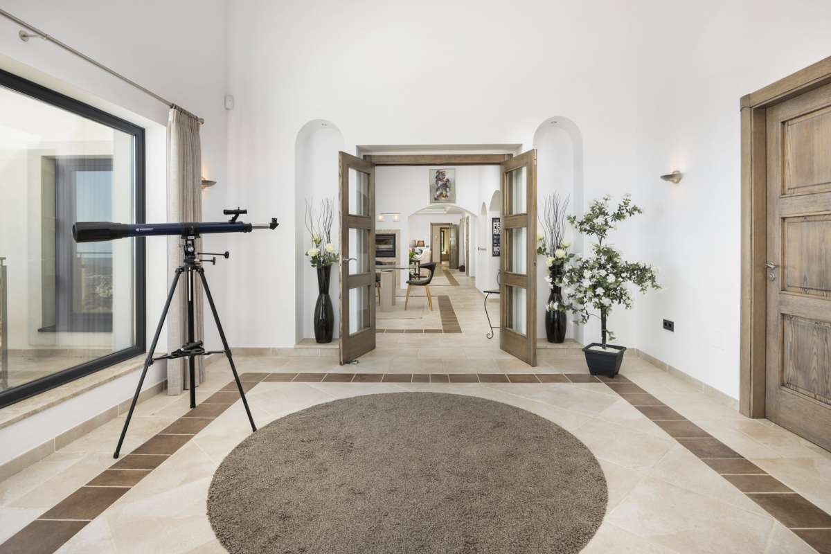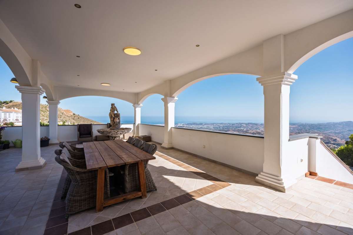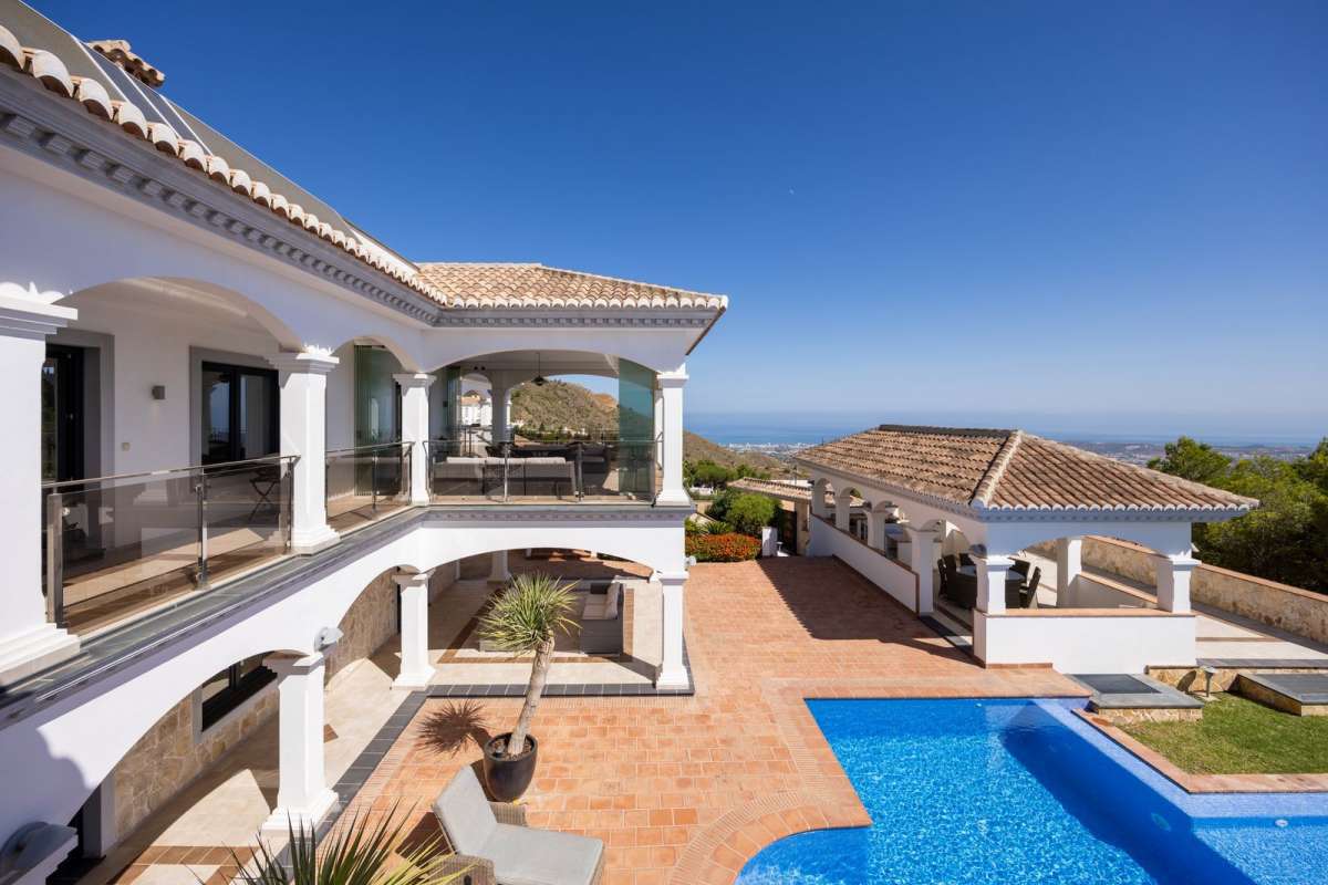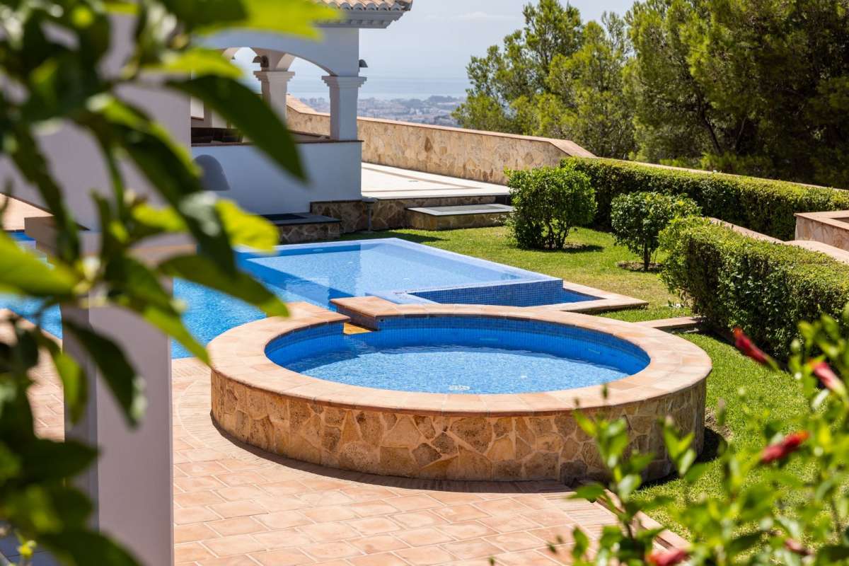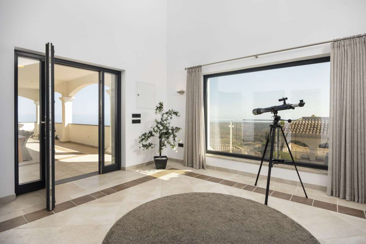 Luxury Villa in Valtocado – Panoramic Views Set in the prestigious and tranquil urbanisation of Valtocado, Mijas, this impressive modern villa offers the ultimate blend of privacy, comfort, and spectacular scenery. Just 20 minutes from Málaga Airport, 15 minutes from Fuengirola, and only 5 minutes from the charming whitewashed village of Mijas Pueblo, the location is as convenient as it is serene. Perched to capture both the Mediterranean Sea and Ronda mountains, this south-facing property enjoys some of the most breathtaking panoramic views on the Costa del Sol. The villa features underfloor heating, hot and cold A/C, tempered glass windows throughout, and solar panels for both water and underfloor heating. There are two lifts: one from the entrance to the garage, and another to the rooftop terrace with jacuzzi. Outdoors, you’ll find an infinity pool, children’s pool, extensive terraces, and a large outdoor kitchen. On the ground floor, a grand entrance hall with guest WC leads into a vast open-plan dining and living area. To one side is a fully fitted modern kitchen with high-end appliances including two ovens, two fridges, two freezers, induction cookers, dishwasher, microwave, and a special tap for filtered drinking water, with direct garden access. On the other side, patio doors open to a large terrace with glass curtains, perfect for enjoying sunrise and sunset year-round. The elegant living room features coloured LED ceiling lighting, direct terrace access, and a lift to the rooftop jacuzzi. The master suite on this floor boasts a wraparound terrace, a luxurious walk-in closet with central island, and an en-suite bathroom with balcony—ideal for soaking in a hot bath while watching the sun set over the Andalusian hills. The lower level, accessible by stairs or lift, includes a second spacious living area with rustic bar, wine shelving, and billiard table, two generous en-suite bedrooms with garden and pool access (one with Turkish bath), a guest WC, large laundry room with kitchenette and storage, and a cinema room with surround sound and theatre seating. A completely independent guest annex offers a bright kitchen, living room, spacious bedroom, bathroom, and an additional utility room for electrics and water systems. The property is surrounded by a wraparound garden with multiple terraces, a saltwater infinity pool plus a children’s pool, and a two-car garage. An eco-friendly septic tank recycles water for irrigation. This villa combines modern luxury, energy efficiency, and unbeatable panoramic views, all in a prime Costa del Sol location.