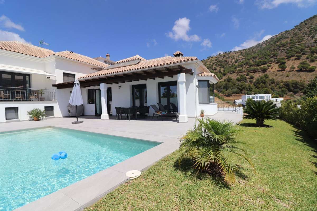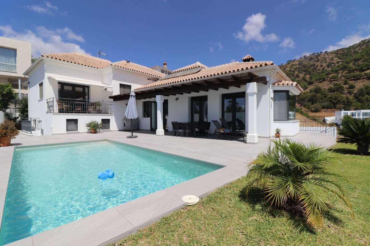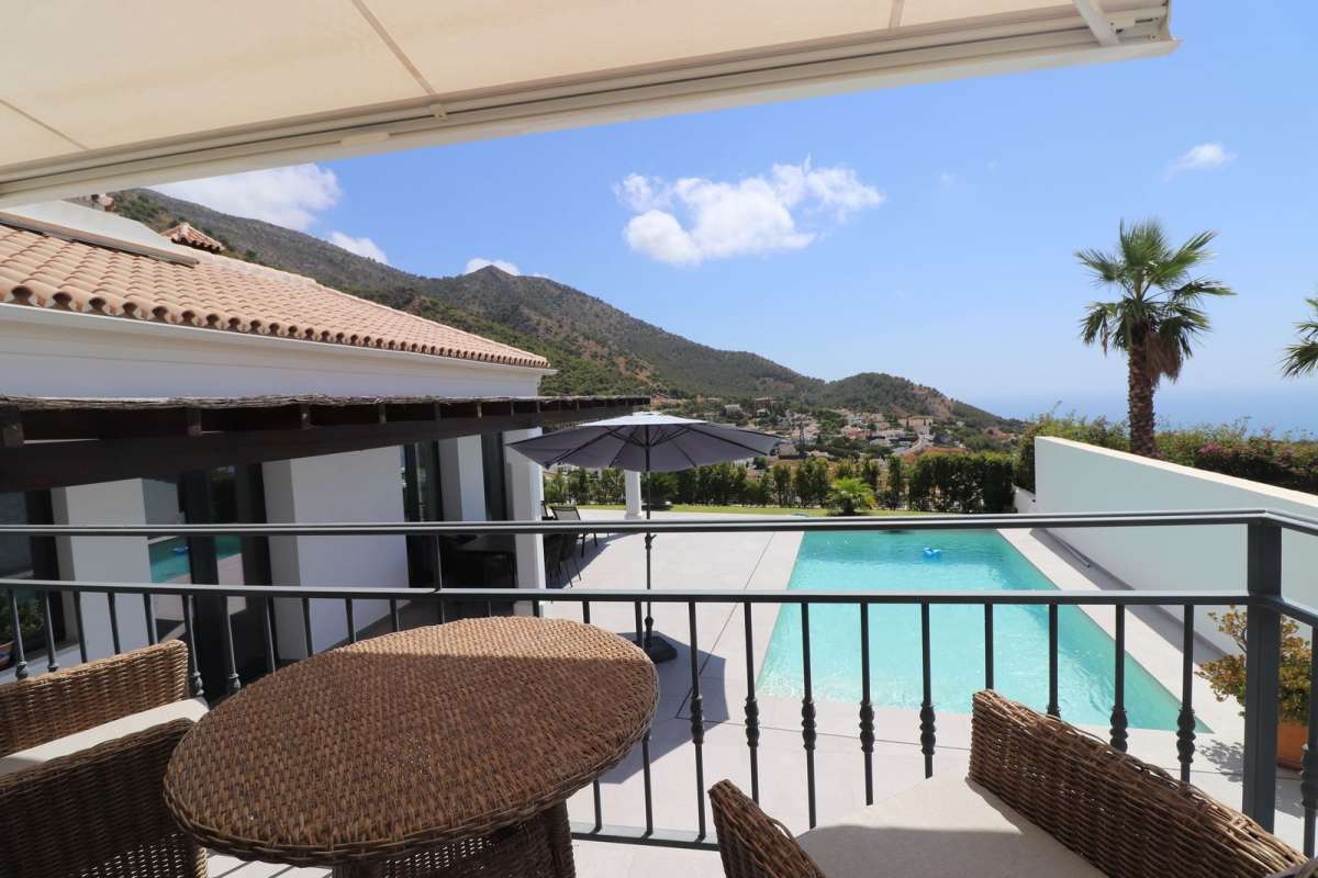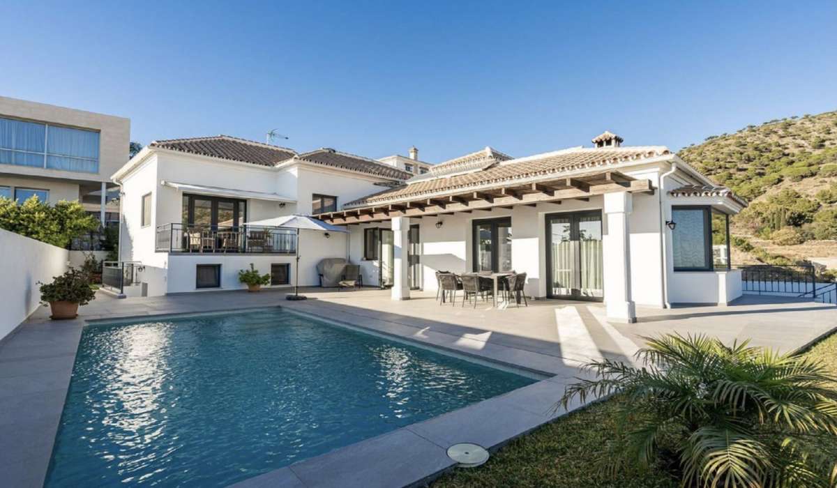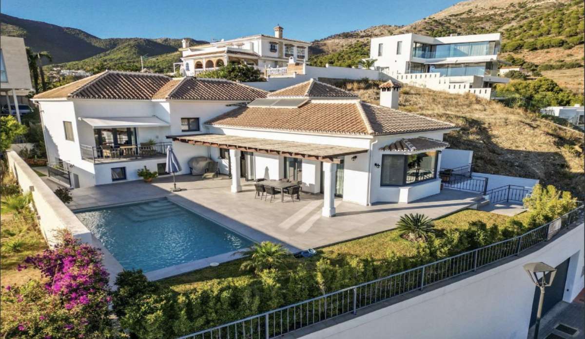 Elegant and Sophisticated Villa with Panoramic Views in Buena Vista, Mijas Perched in the sought-after residential enclave of Buena Vista, Mijas, this exquisite villa built in 2018 perfectly blends elegance, comfort, and modern design. With breathtaking panoramic views of the sea, coast, and mountains, this is a unique opportunity to enjoy luxury living in one of the most desirable locations on the Costa del Sol. Property Overview Located within a secure and tranquil gated community with 24-hour security, the villa enjoys a southeast orientation and is distributed over three well-planned levels, offering privacy, functionality, and style throughout. Main Floor Spacious, bright living room with large windows and double patio doors opening onto a covered terrace and private pool area. Cozy fireplace with a cast iron wood burner for year-round comfort. Separate, fully equipped kitchen and dining area with high-end appliances. Guest cloakroom. Direct access to the terrace, ideal for al fresco dining and relaxing with stunning views. First Floor Master bedroom with a private balcony and an en-suite bathroom featuring a walk-in shower. Two additional double bedrooms sharing a modern family bathroom with walk-in shower. Lower Level Generously sized fourth bedroom with en-suite bathroom and walk-in closet. Indoor pool shower and changing room just a few steps down. Vast multi-use area with potential for a home cinema, gym, or entertainment room, with pre-installation for a bathroom. Laundry room, storage rooms, and space housing the solar-powered hot water system. Large lock-up garage with capacity for up to four cars or a boat. Exterior Features Private swimming pool surrounded by a spacious sunbathing area. Dedicated BBQ area for outdoor entertaining. Low-maintenance garden with mature trees and shrubs surrounding the property. Large covered terrace connecting the living and kitchen areas—perfect for enjoying the panoramic views year-round. Large water purification system installed. Location Highlights Less than 10 minutes to the beach. Only a 10-minute drive to both Mijas Pueblo and Benalmádena Pueblo. Quick access to the A7 motorway and Málaga Airport, ideal for commuters and frequent travelers. Additional Features Underfloor heating throughout. Ducted dual air conditioning system. Elegant oak interior doors. Fully furnished and move-in ready. This impressive villa represents a rare opportunity to acquire a high-quality home with stunning views, modern amenities, and an unbeatable location. Whether you're looking for a permanent residence, a holiday home, or an investment property, this home checks all the boxes. Contact us today to arrange your private viewing—this exceptional property won’t stay on the market for long.