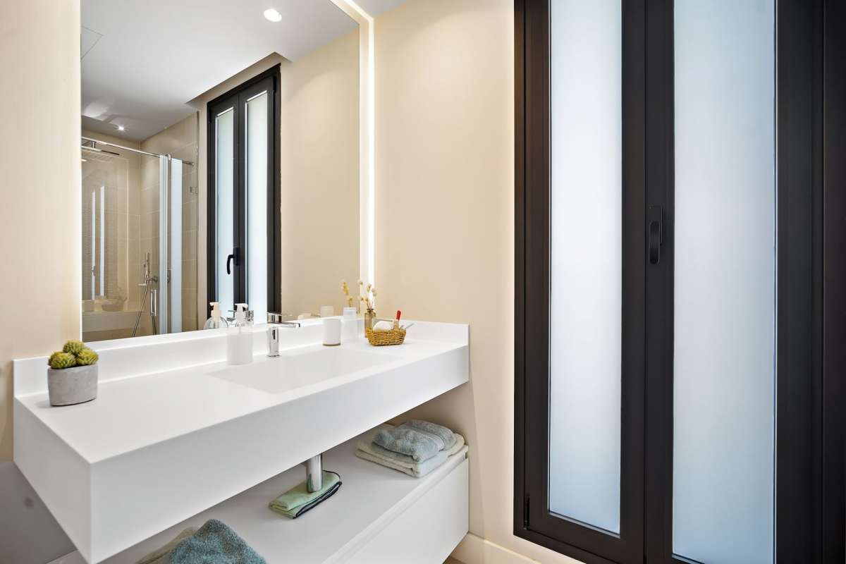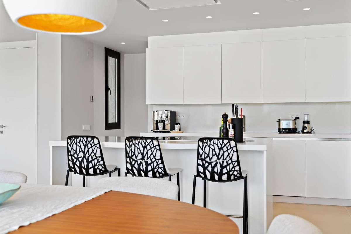 On the ground floor, you will find a spacious lounge with a cosy dining area alongside with direct access to the terrace. The dining area is connected to the open kitchen which offers the laundry room and separate toilet behind it. On the first floor you have 2 beautifully decorated spacious bedrooms en suite with access to the first-floor terrace and panoramic sea views. On the min 1 there are 2 more spacious bedrooms with a shared bathroom.
