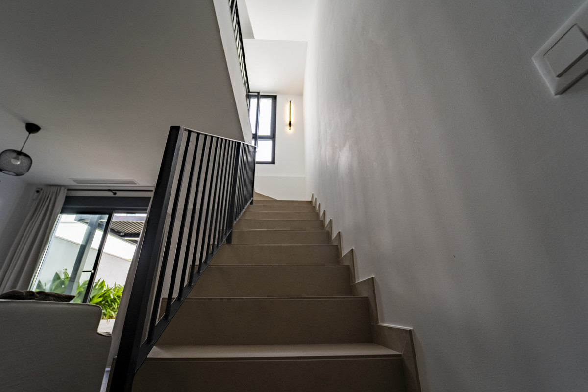 On the first floor, two well-appointed bedrooms provide cozy sleeping arrangements—one with a double bed and the other with two single beds. The top floor is reserved for the master suite, complete with a private bathroom and an exclusive terrace, offering the perfect spot to enjoy quiet moments in the sun.