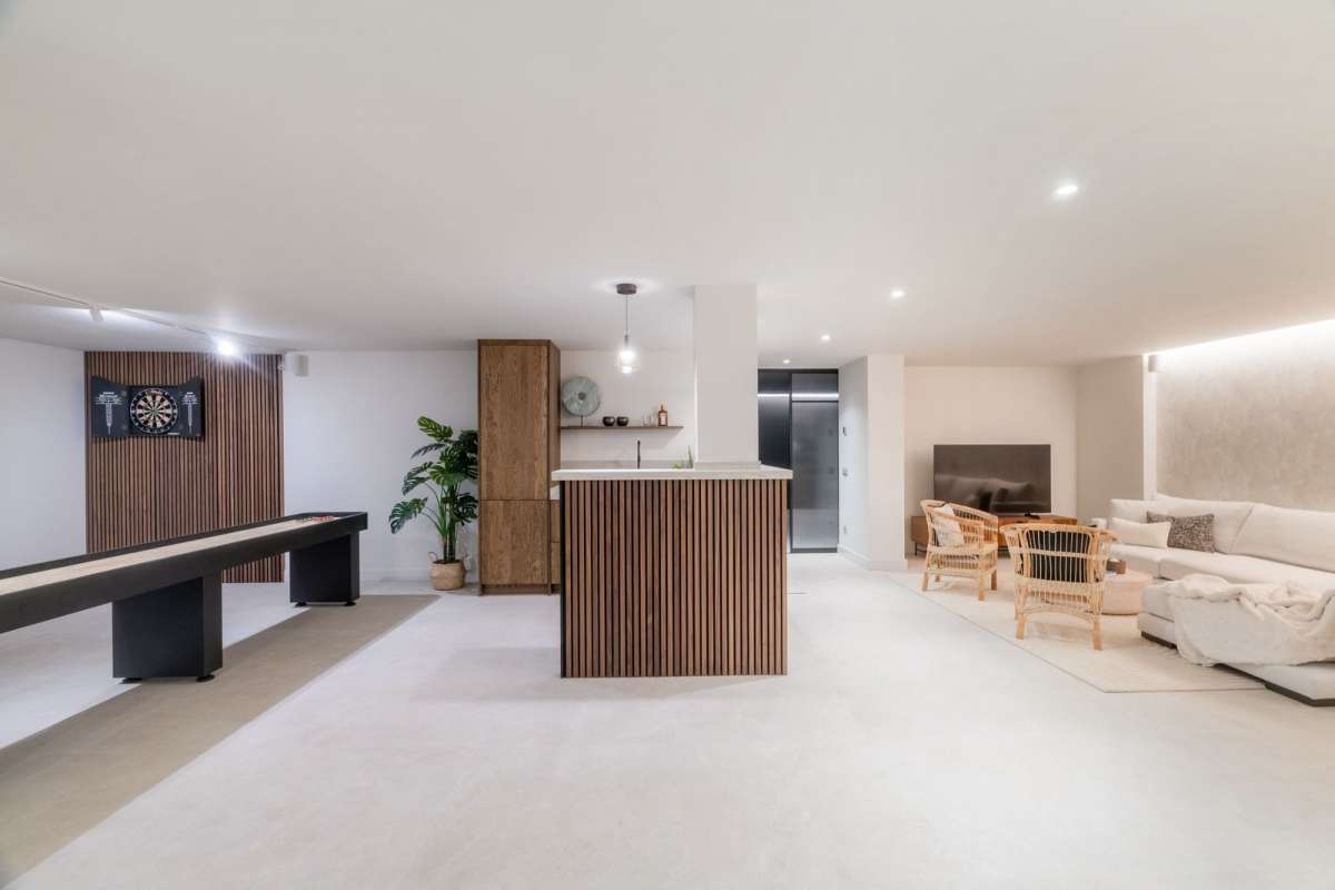 The open-plan main floor is tailored for modern living, featuring a bright and stylish lounge alongside a bespoke Swedish kitchen fitted with premium Miele appliances, dark oiled Oak cabinetry, and sleek Dekton countertops. The adjacent dining area is perfect for both intimate family meals and entertaining guests.