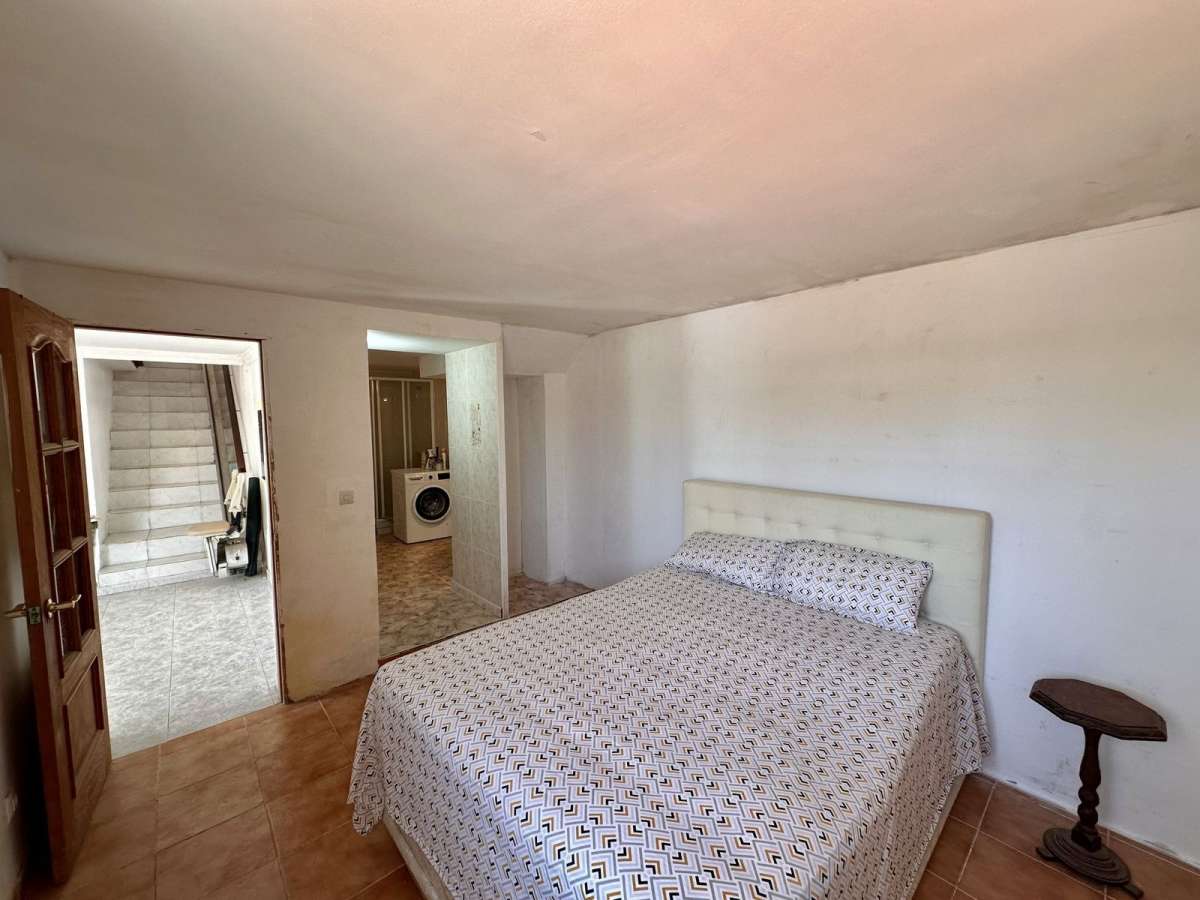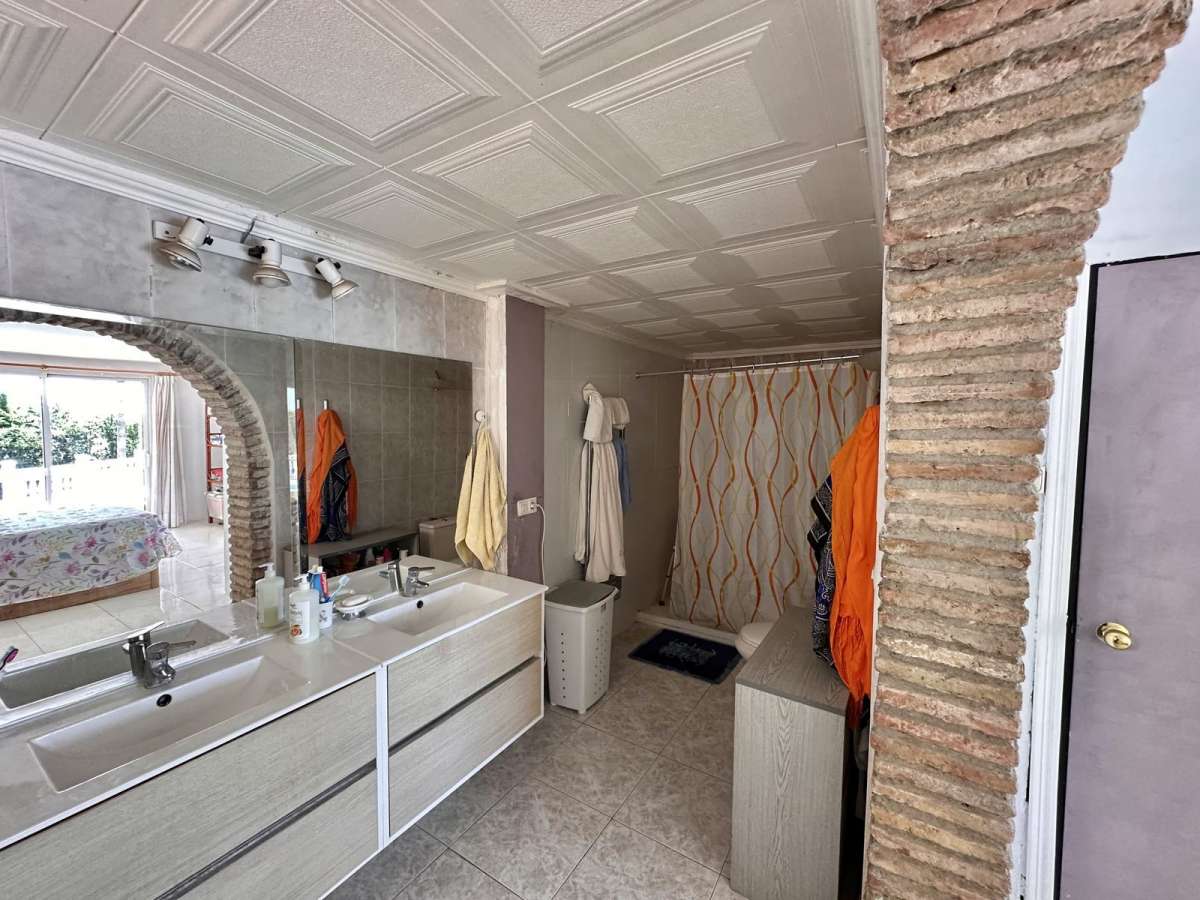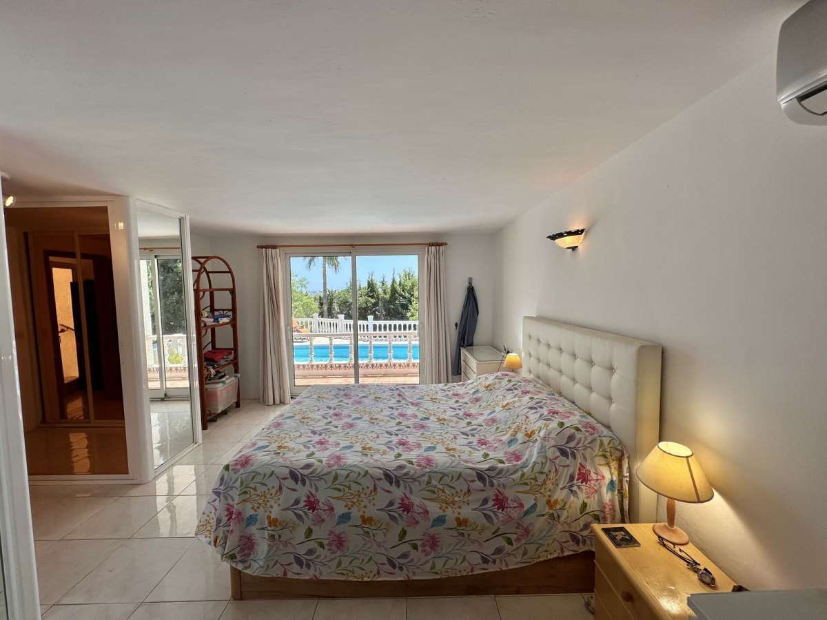 Features the master bedroom with en-suite bathroom and views over the pool, plus an additional en-suite bedroom. A lounge area, currently used as an office, sits between the two bedrooms and opens directly onto the pool area, a covered terrace, and a sun-drenched uncovered terrace that leads to a large plot filled with a variety of fruit trees.