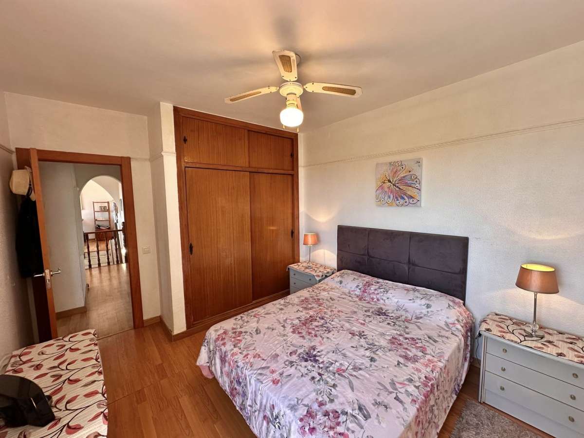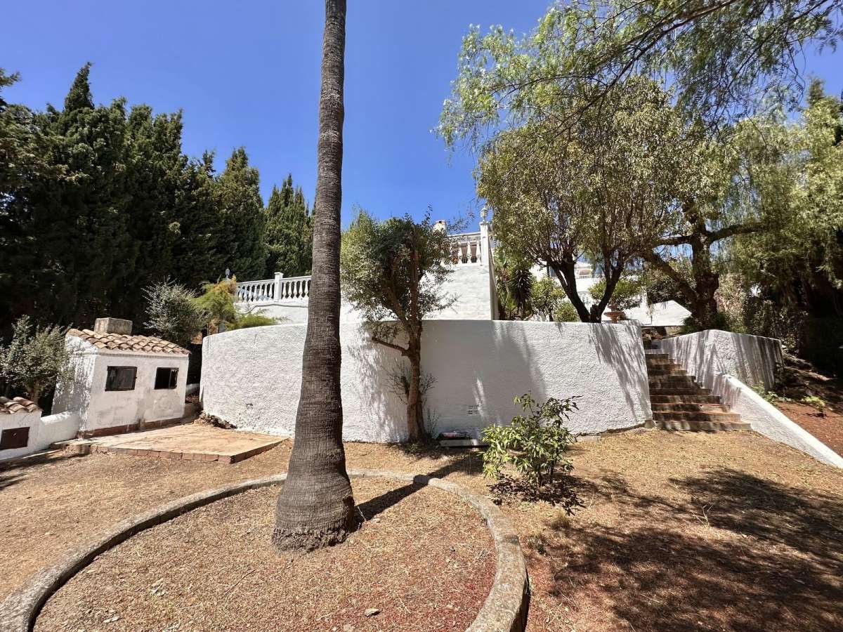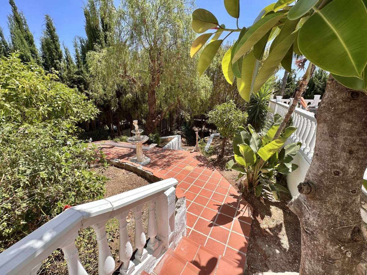 Features the master bedroom with en-suite bathroom and views over the pool, plus an additional en-suite bedroom. A lounge area, currently used as an office, sits between the two bedrooms and opens directly onto the pool area, a covered terrace, and a sun-drenched uncovered terrace that leads to a large plot filled with a variety of fruit trees.