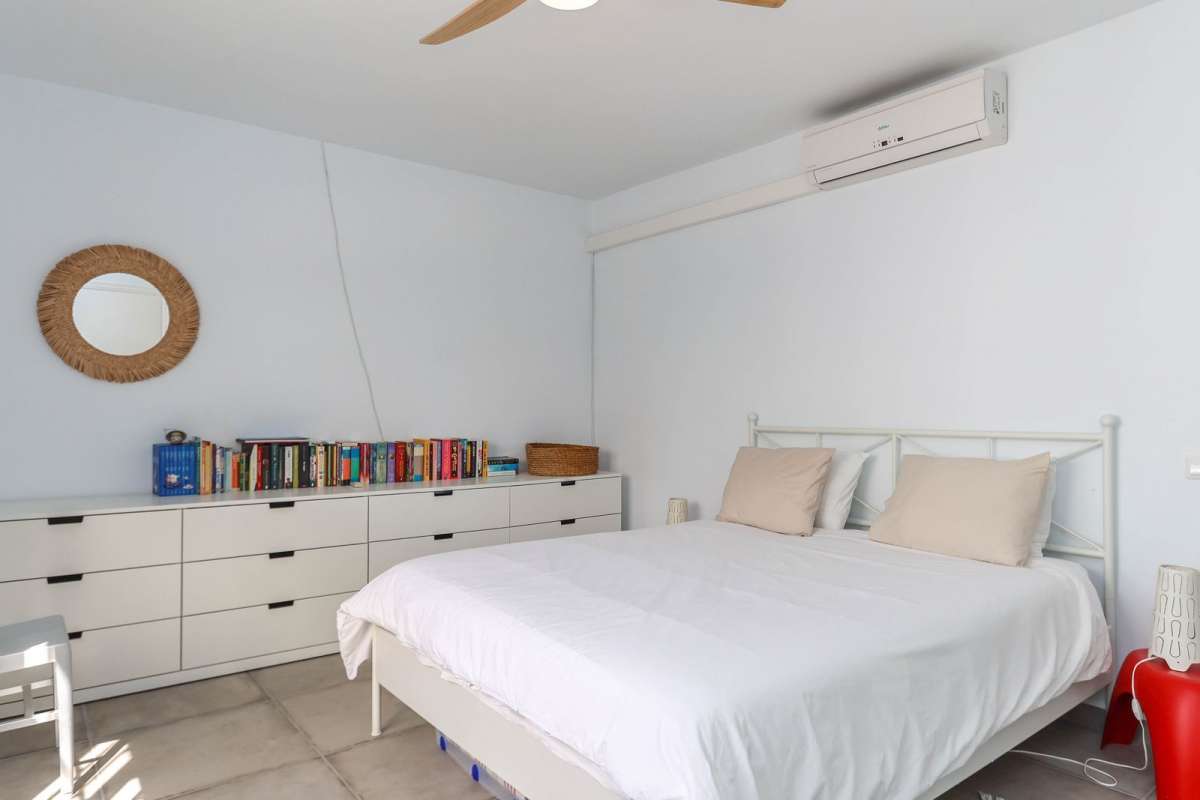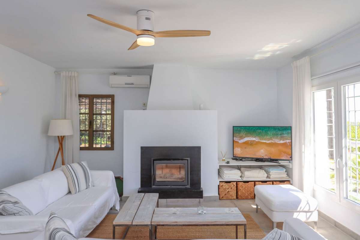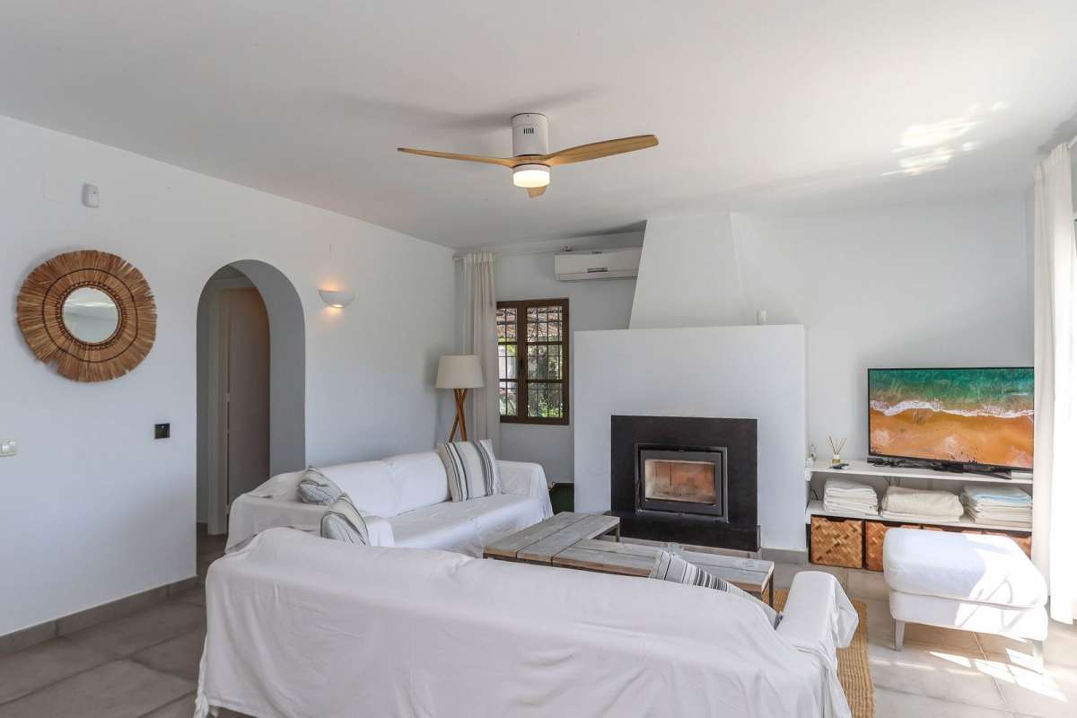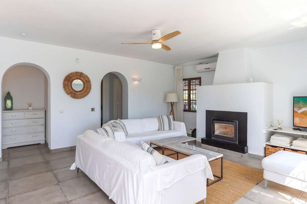 Inside, the villa feels refreshingly cool and inviting. The lounge centers around a striking fireplace, adding a cozy touch for winter evenings. The open-plan kitchen seamlessly connects to the living area and extends out to a covered dining terrace, perfectly positioned to overlook the pool.