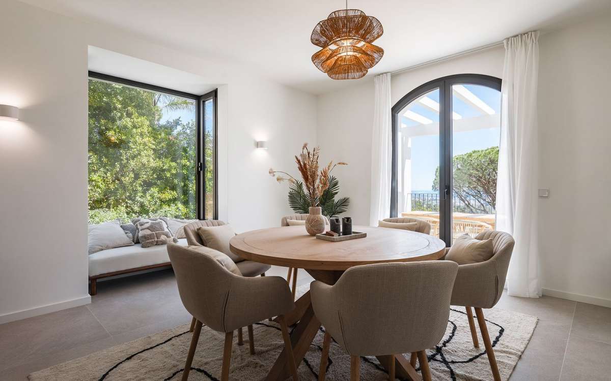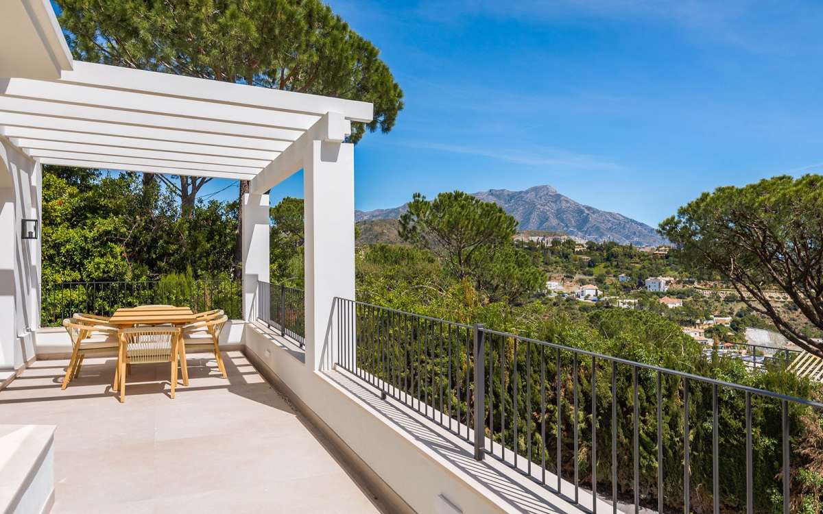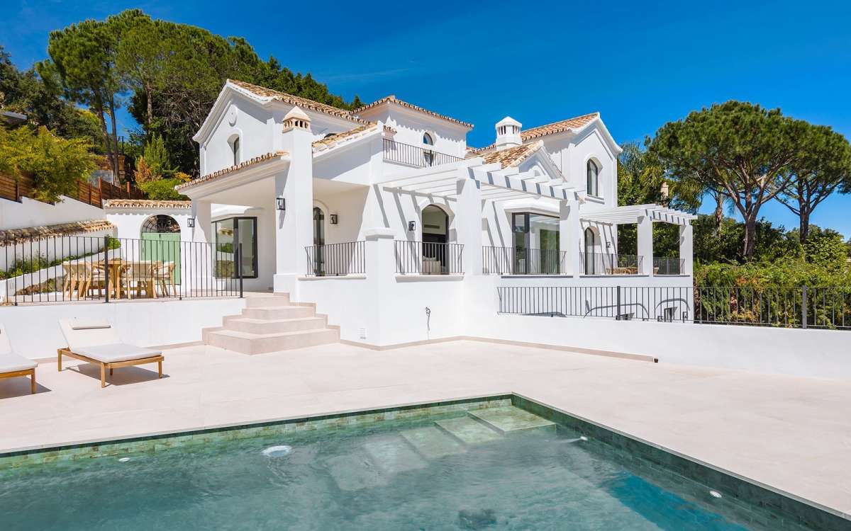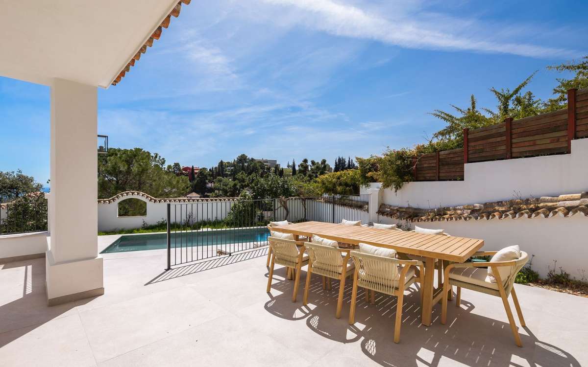 This elegantly renovated luxury villa offers a refined lifestyle within an exclusive, secure gated complex. Enjoying a desirable south to south- east orientation, the property boasts breathtaking sea views and abundant natural light throughout the day. The villa features five spacious bedrooms and five well-appointed bathrooms, providing ample space and comfort for both family and guests. The fully fitted eat-in kitchen combines functionality with style, ideal for casual dining, while a separate formal dining room offers an inviting setting for entertaining. The main living room provides a comfortable and stylish space to relax, complemented by a versatile entertainment room that can be adapted to suit a range of leisure activities. The home is equipped with underfloor heating throughout, as well as hot and cold air conditioning, ensuring year-round comfort. Outside, the private garden and swimming pool create a tranquil retreat, perfect for both quiet moments and social gatherings. Additional features include a generous driveway with access to a two-car garage, offering convenience and security. Situated in a gated urbanisation, the property guarantees peace of mind and a high level of privacy. The villa is sold fully furnished, allowing for a seamless transition and immediate enjoyment. Viewings are highly recommended to truly appreciate the quality, comfort, and stunning setting of this exceptional home. El Madroñal is only 2 minutes drive to Monte Halcones Commercial centre with its cafes, supermarket and shops, and a further 5 minutes to San Pedro Town and the beach.