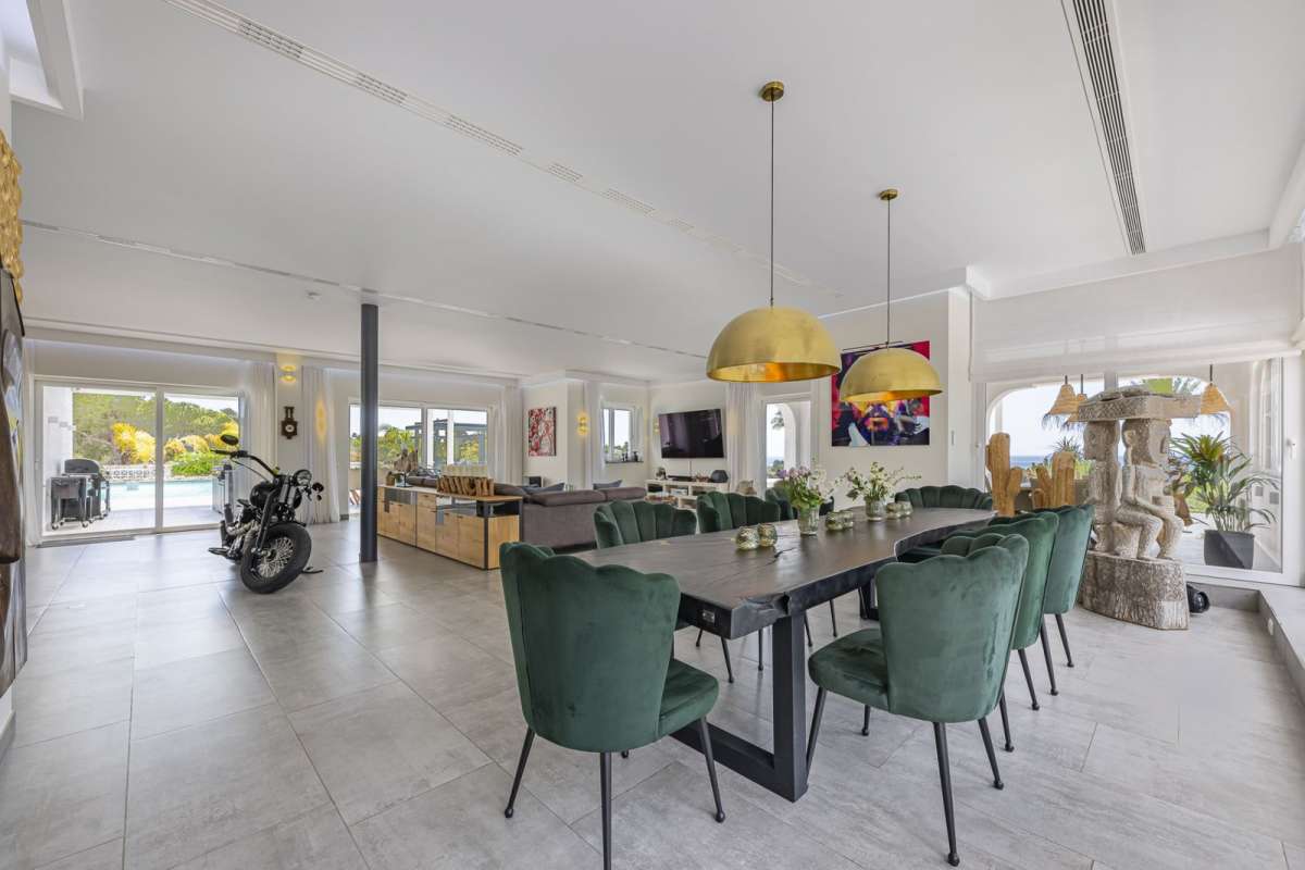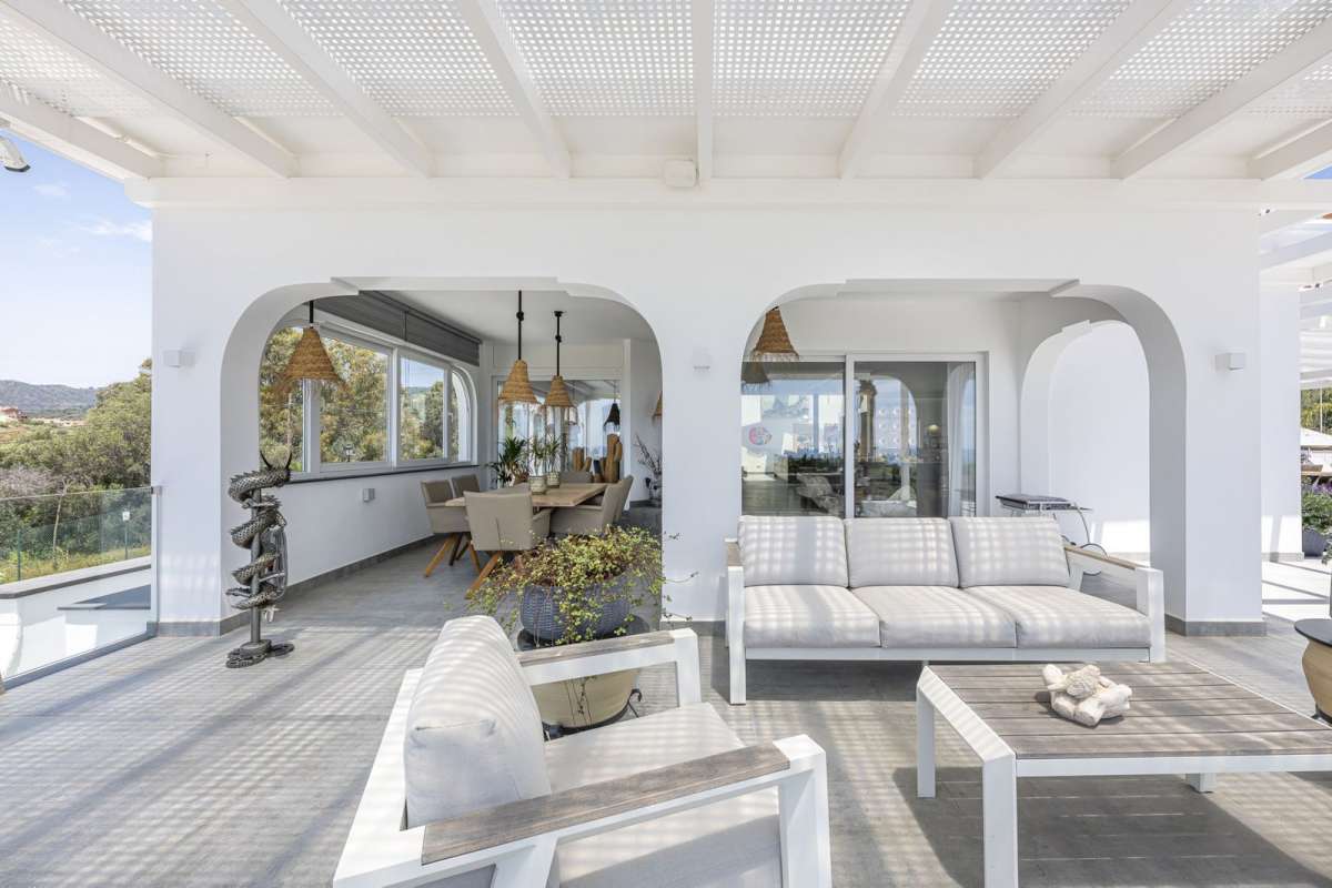 Inside, the villa feels bright, open and welcoming. The heart of the home is the spacious living room, designed with floor-to-ceiling glass doors that open directly onto the terrace, framing fantastic views of the sea and surrounding greenery. Natural light floods in from all angles, creating a warm and inviting atmosphere. The contemporary kitchen with breakfast area flows naturally into this space, making it ideal for family life and entertaining. There are four deluxe bedrooms, including a main suite with indoor and outdoor showers.