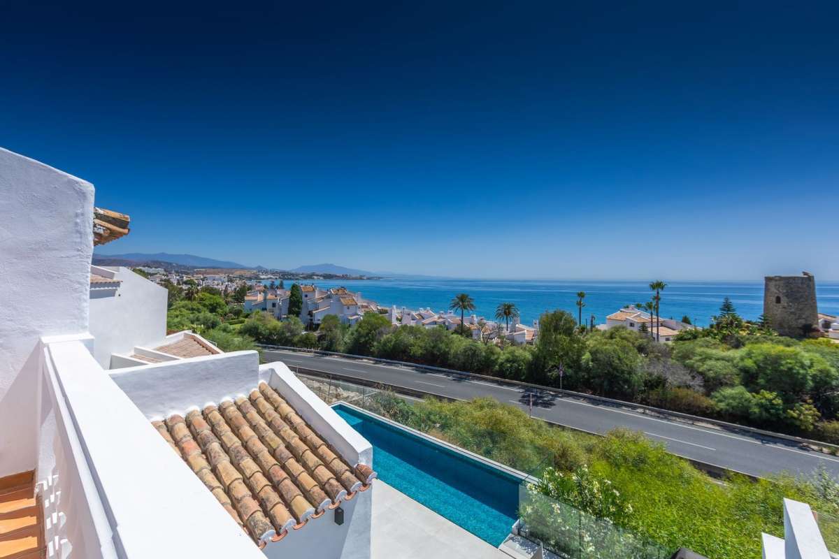 Charming villa with panoramic views of the sea, mountains, Gibraltar, and Africa, located in a privileged area with direct access to beautiful beaches via a convenient footbridge or a practical underground tunnel. This property is part of a unique architectural complex designed by renowned European architect Aubrey David, widely awarded for his innovative and aesthetic approach. Set within a well-established and meticulously maintained residential community, it offers access to six communal swimming pools, mature gardens, a gym, and a tennis court. Each villa in the complex features a unique design and layout, adding to the exclusive character of the community. The villa enjoys an excellent location, just a short drive from Estepona, La Duquesa, and Sabinillas, and well connected to Sotogrande, Marbella, Gibraltar, and Málaga Airport. All essential services, supermarkets, schools, and the new hospital, are conveniently close, just 2 km away. Ideal for golf enthusiasts, the property is next to Estepona Golf and close to prestigious courses such as Finca Cortesín. Facing southeast and recently renovated, the villa retains its charming original rustic style. It is laid out over several levels, allowing for an abundance of natural light through its many windows. The home features several terraces with different orientations, a private pool, and a spacious covered parking area. A property full of character, charm, and an unbeatable location. Highly recommended for viewing.
