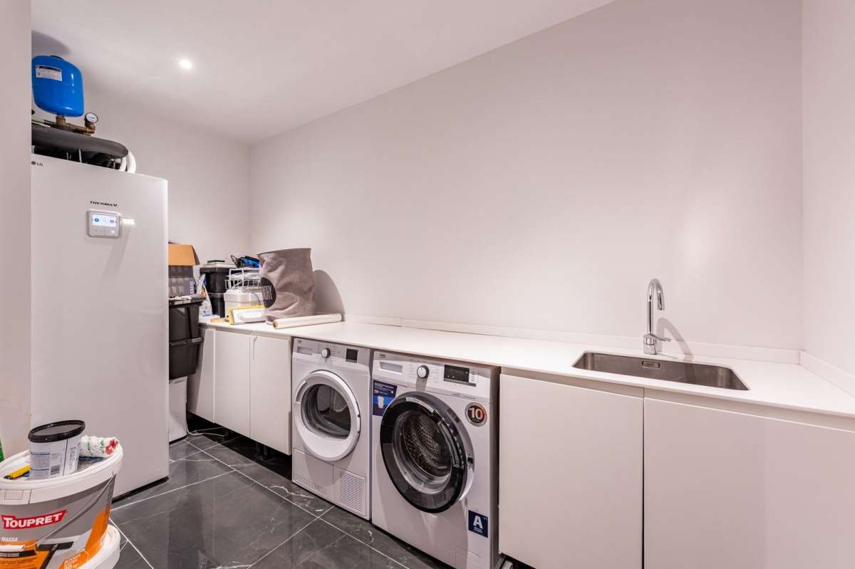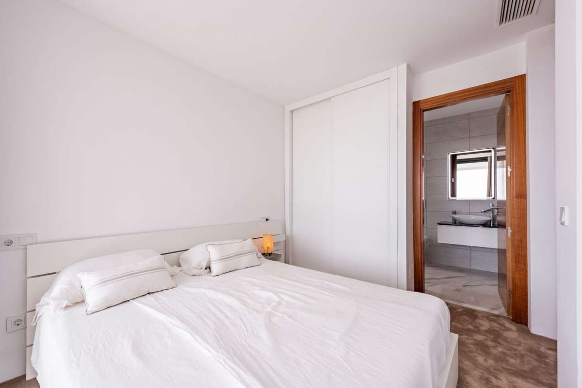 The house is designed with a focus on light, space, and comfort, featuring a private pool and a rooftop terrace with spectacular views. On the entrance level, you’ll find an open-plan kitchen and dining area opening onto large windows and a fantastic terrace, perfect for relaxation or social gatherings. One floor down is a stylish and cozy TV room, while the upper floor accommodates three bedrooms with three bathrooms and a generous balcony with magical views. The villa’s rooftop terrace elevates the experience even further with even more impressive vistas.