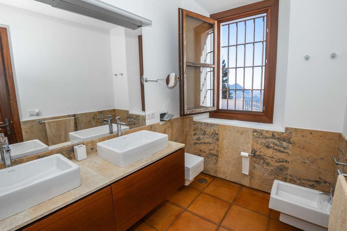 The house features over 550 m² of interior space, with 4 spacious bedrooms, each with an en-suite bathroom, plus an additional guest toilet. Large windows and multiple terraces maximize the natural light and frame the stunning panoramic scenery.