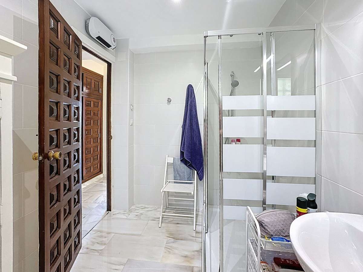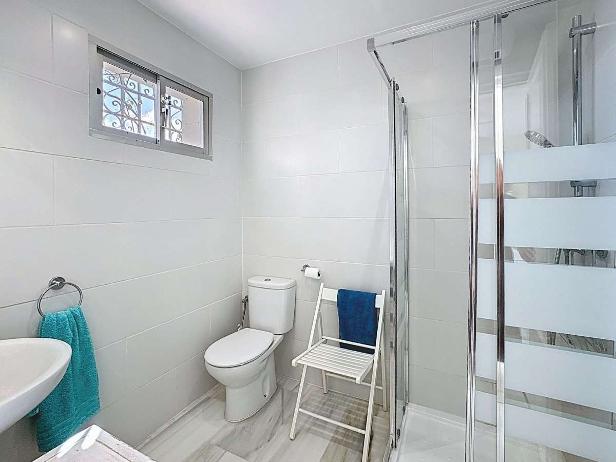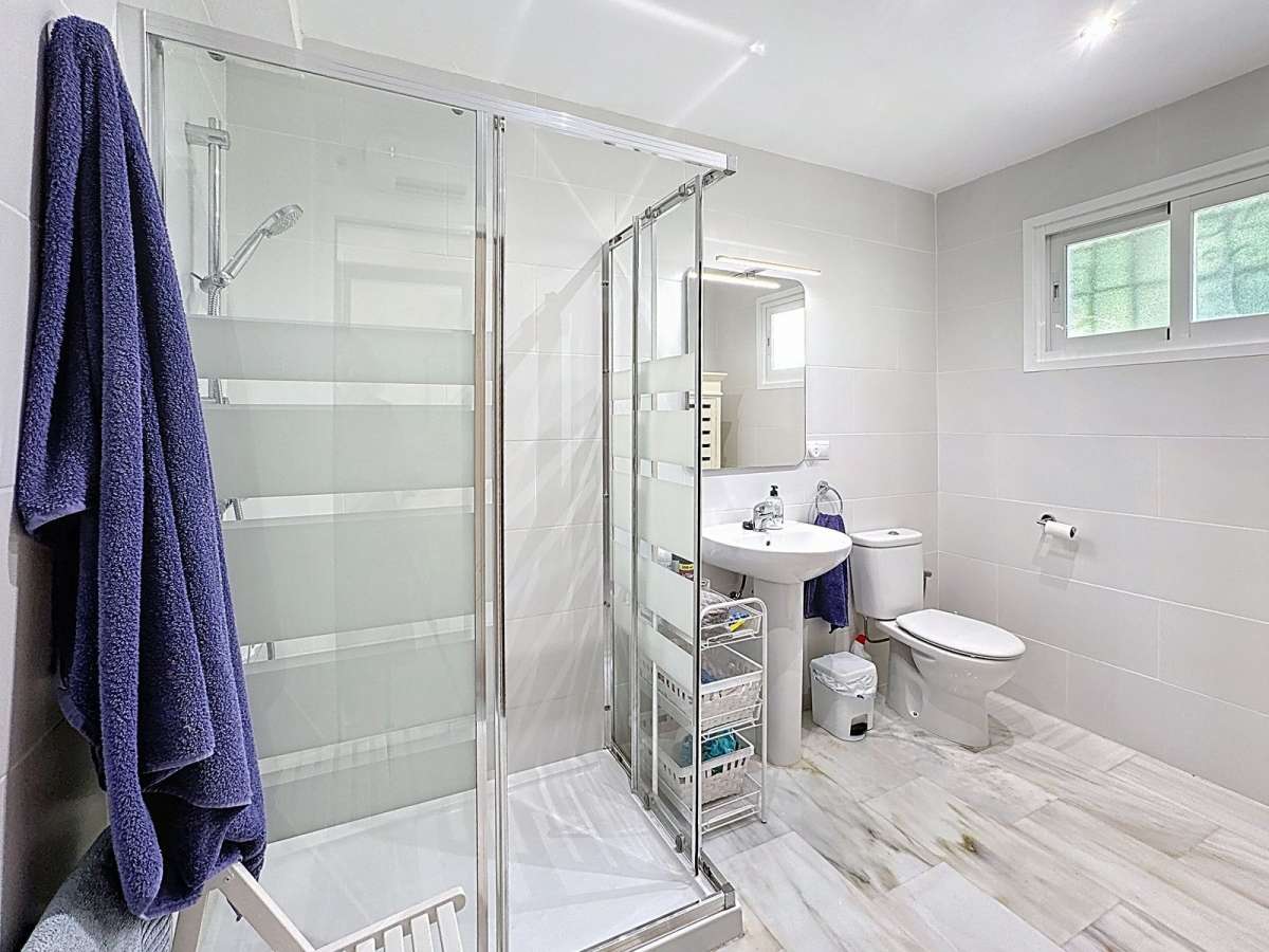 From the living area, a few steps lead up to the master bedroom with an ensuite bathroom and direct access to the terrace, plus another bedroom and a separate bathroom on the same level. A few steps down, you’ll find two additional bedrooms sharing a bathroom; one of them opens directly to the terrace and pool area.