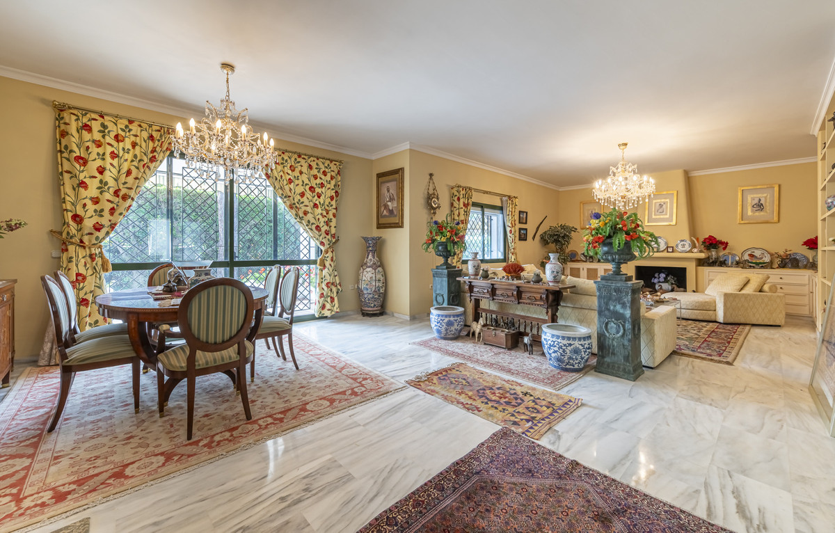 Located in the heart of Marbella’s prestigious Golden Mile, in the exclusive residential area of Nagüeles, this exquisite villa embodies the essence of Mediterranean luxury living. A residence of classic design and refined character, offering sophistication, privacy and comfort in one of the most sought-after areas on the Costa del Sol. Set on a generous 1,018 m² plot, the property boasts 682 m² of constructed space, masterfully distributed to meet the expectations of the most discerning buyers. Every room is elegantly appointed with noble materials, such as marble flooring, and furnished with premium-quality pieces. The villa features four spacious bedrooms, two of which enjoy en-suite bathrooms, along with three full bathrooms and a guest toilet. The main living area offers a serene, light-filled atmosphere, with a cosy fireplace lounge, an independent dining room, and a fully equipped kitchen, ideal for everyday living or entertaining in style. Outdoors, the villa opens up to a peaceful and lush setting, with a manicured private garden, a stylish barbecue area, and a private pool surrounded by sun-drenched terraces and chill-out corners that guarantee complete privacy in a tranquil ambience. An extensive multipurpose basement offers ample space to create a home cinema, wine cellar, gym, game room or any bespoke retreat. The property also includes a private garage. Ideally located just minutes from central Marbella, top international schools, prestigious golf courses and the glamour of the Golden Mile, this residence is the perfect sanctuary for those seeking a high-end home with outstanding renovation potential to personalise and elevate to their unique taste.