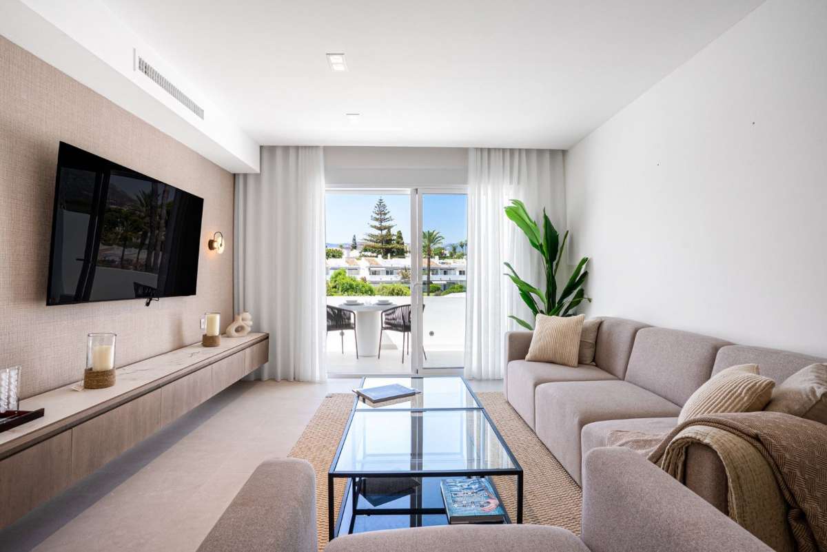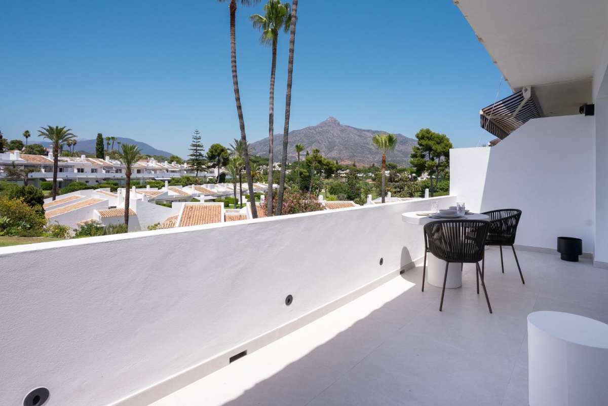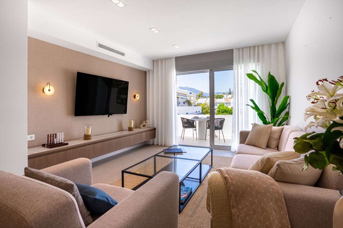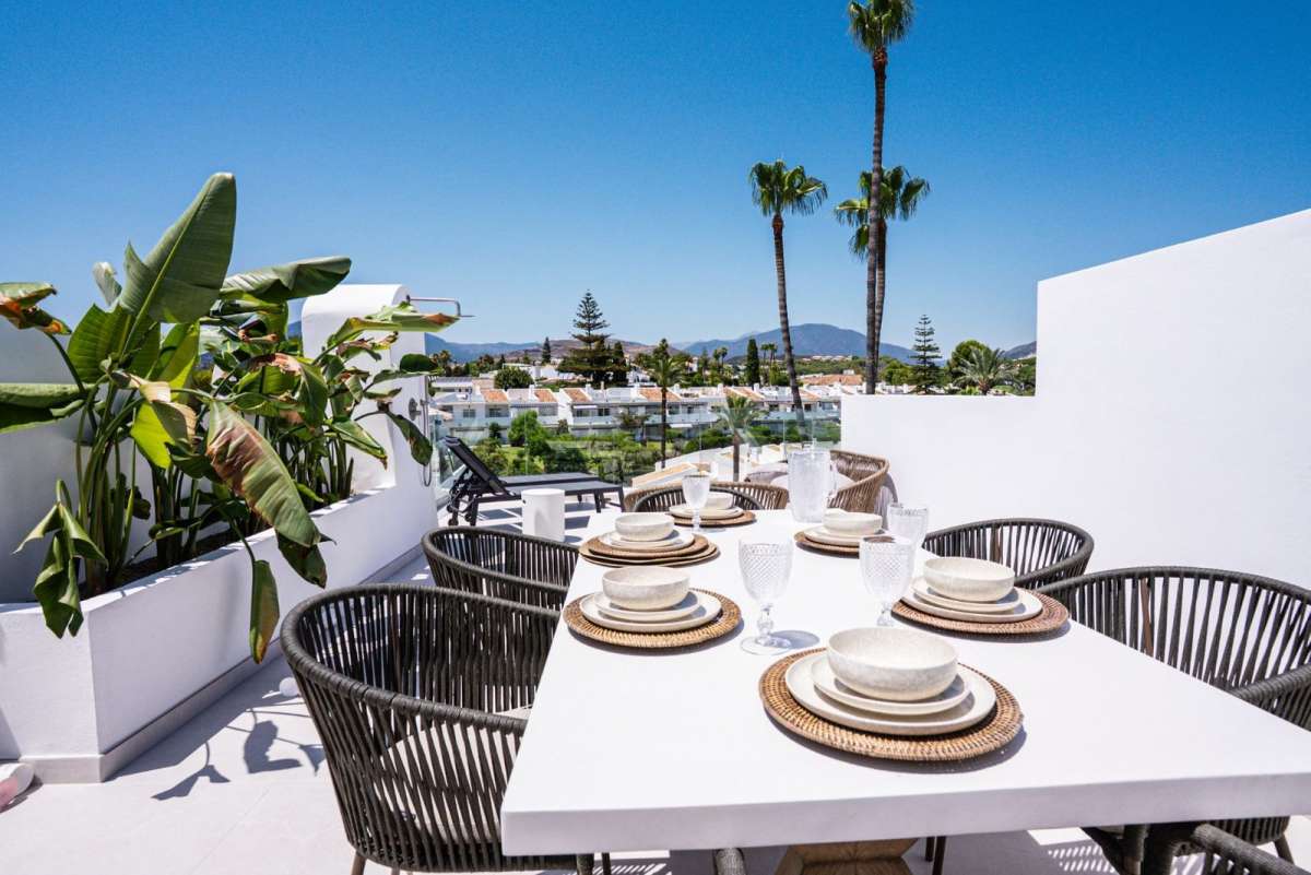 Nestled in the heart of Marbella’s sought-after Golf Valley in Nueva Andalucía, this completely renovated duplex penthouse corner unit offers a rare opportunity to experience refined Mediterranean living with a touch of Scandinavian elegance. Located within a secure, gated community that features top-tier amenities—including a modern gym, indulgent spa, tennis and padel courts, a communal pool, lush gardens, and underground parking—this residence combines comfort, sophistication, and lifestyle in perfect harmony. Upon entering, you’re welcomed into a bright, open-plan living and dining area that exudes contemporary flair with its sleek finishes and effortless flow. Floor-to-ceiling sliding windows bathe the space in natural light and lead out to a private terrace, generously sized for outdoor lounging and dining. Just off the dining space, the fully fitted kitchen showcases clean lines, modern appliances, and ample storage, making it both functional and stylish—ideal for casual meals or hosting guests. The two bedrooms are masterfully designed, offering a serene atmosphere with fitted, spacious wardrobes and beautifully appointed ensuite bathrooms. Each bathroom features walk-in rain showers and high-end fixtures, bringing a spa-like feel to everyday living. The master suite is a true retreat, with large sliding doors that also open onto the terrace, enhancing the indoor-outdoor connection. Above it all, the private rooftop solarium is the crown jewel of this home. Designed for ultimate relaxation and entertaining, it boasts 360º panoramic views across the coast and towards the iconic La Concha mountain. Here, you'll find a built-in BBQ, a fully equipped outdoor kitchenette, a dining area, an outdoor shower, and ample space to unwind under the sun or stars—an idyllic setting that defines luxurious Mediterranean lifestyle. This exceptional penthouse blends sleek contemporary design with timeless comfort and is ideally situated close to world-class golf courses, the vibrant Puerto Banús marina, fine dining, and boutique shopping. Whether as a primary residence, a stylish second home, or a savvy investment, this property offers a sophisticated retreat in one of Marbella’s most prestigious enclaves.