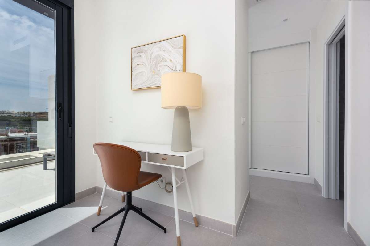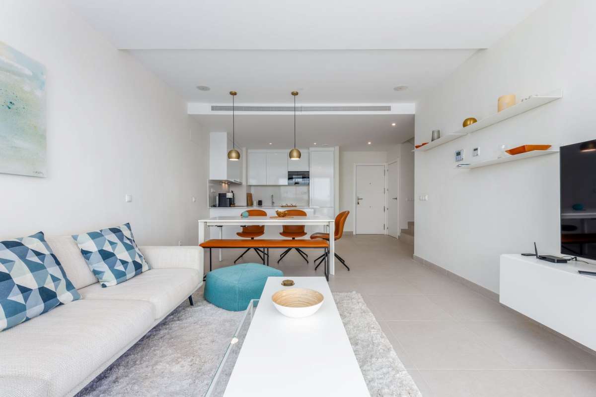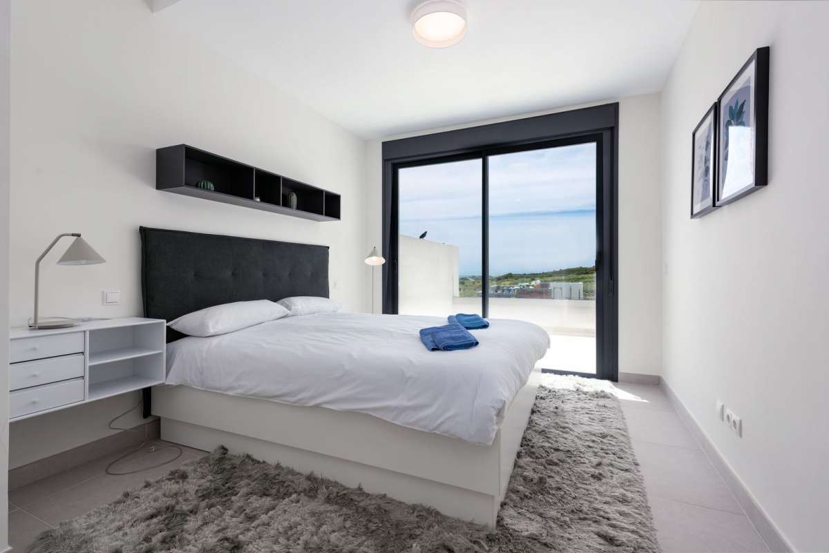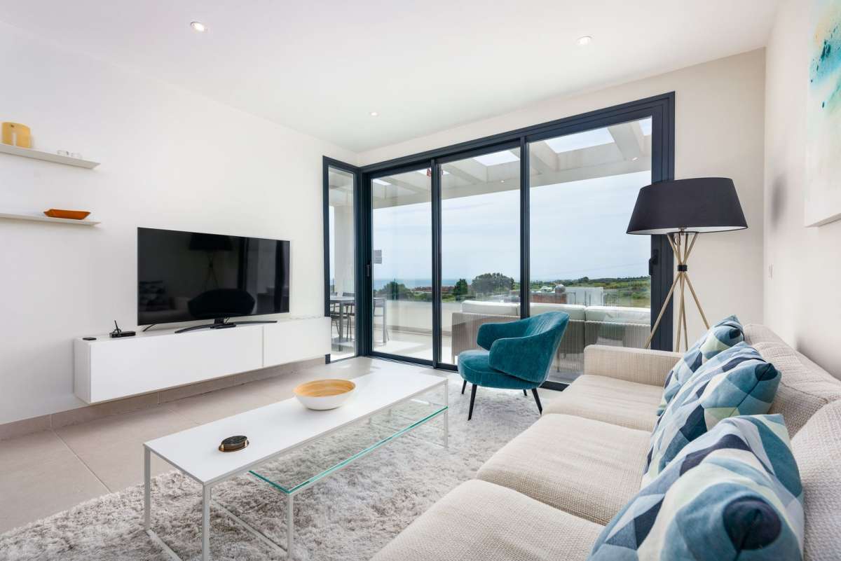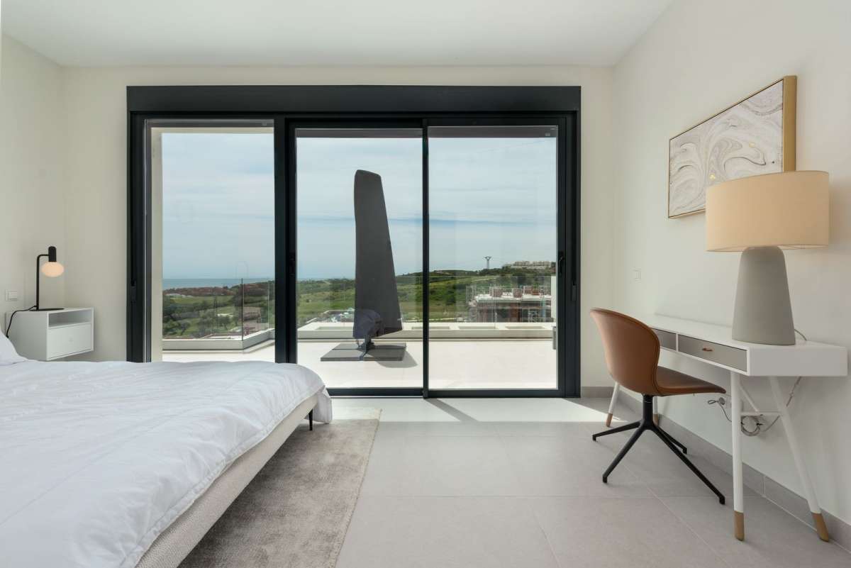 Featuring 3 spacious bedrooms and 2 modern bathrooms, it boasts an open-plan kitchen and two large terraces, perfect for enjoying the breathtaking views of the golf course, sea, and mountains. The master bedroom includes an en-suite bathroom and private terrace access.