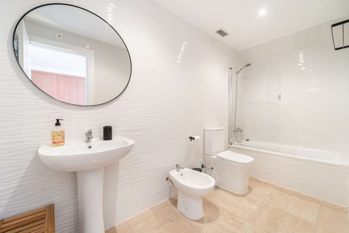The ground floor boasts an inviting open-plan living area that seamlessly opens onto a large south-facing terrace. This level also includes a modern, fully fitted kitchen, a full bathroom with a walk-in shower, and a bedroom with direct terrace access.