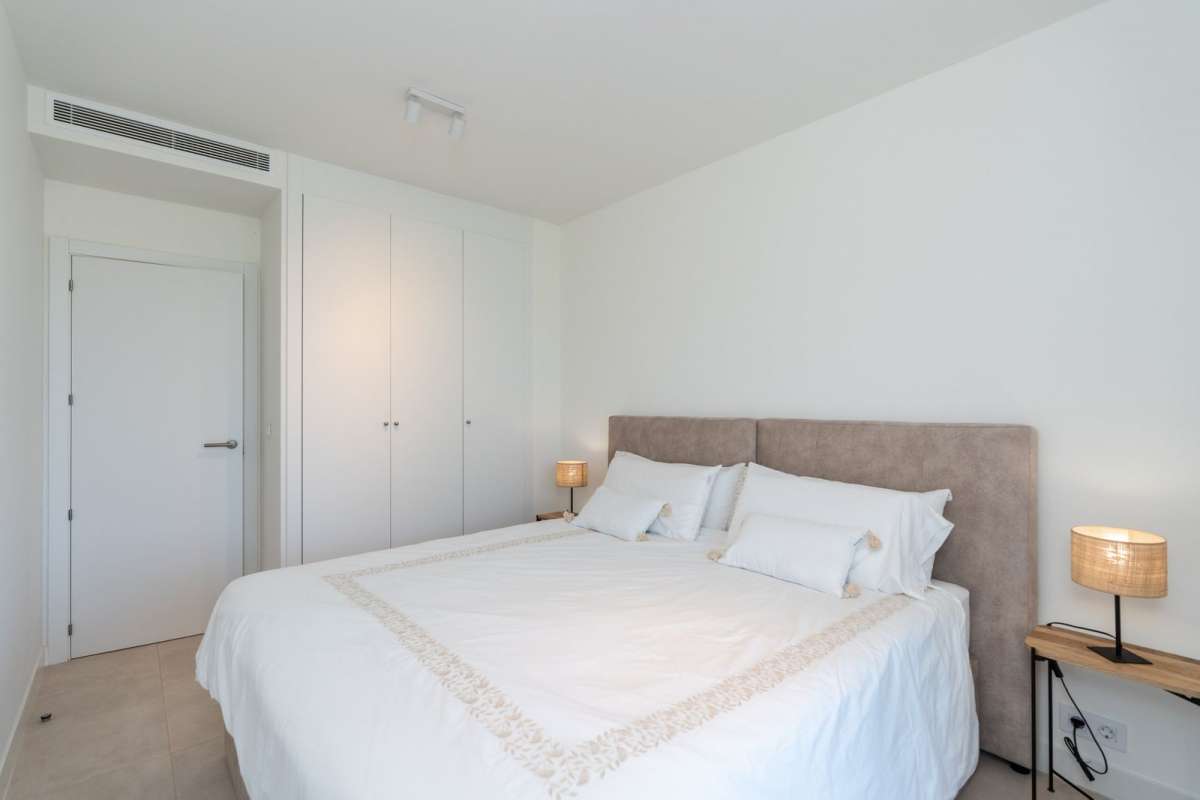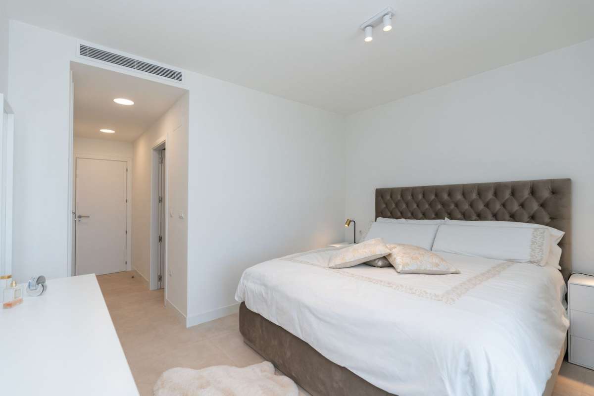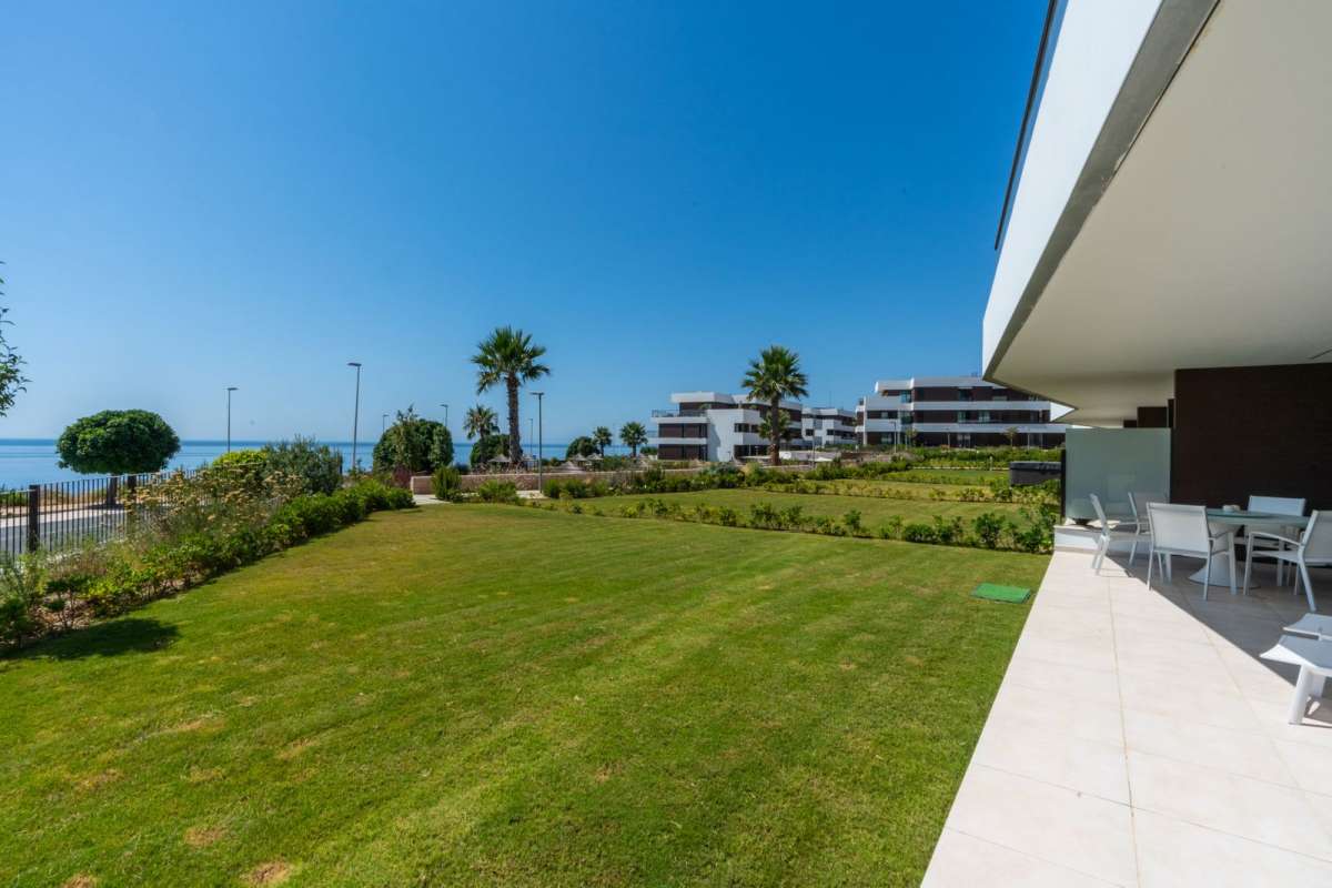 Stunning 3 bedroom 2 bathroom apartment with spectacular sea views in the prestigious new development of La Sabina, Camarate Golf. It is an elevated ground floor and its spacious and bright living-dining room with integrated modern kitchen with an island gives direct access to the incredible 45m2 terrace with covered and uncovered areas, plus a private garden of 240m2 perfect for relaxing moments or al fresco dining all year round. The master bedroom, also with direct access to the terrace, has an en-suite bathroom and large fitted wardrobes. The other two bedrooms share a bathroom and also have fitted wardrobes. The qualities of the apartment include air conditioning hot/cold, electric blinds amongst others, and there is a parking space and storage room included in the price.