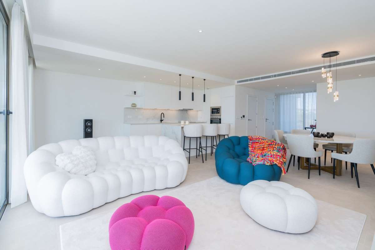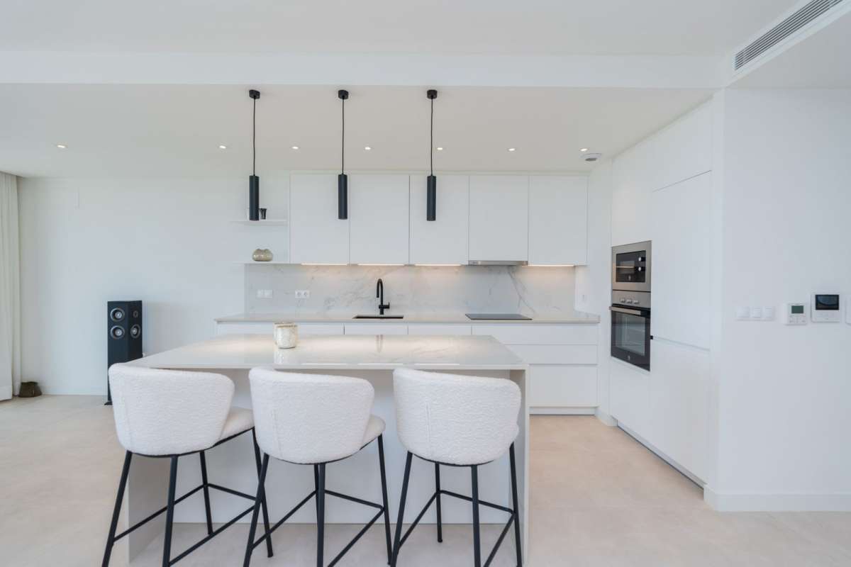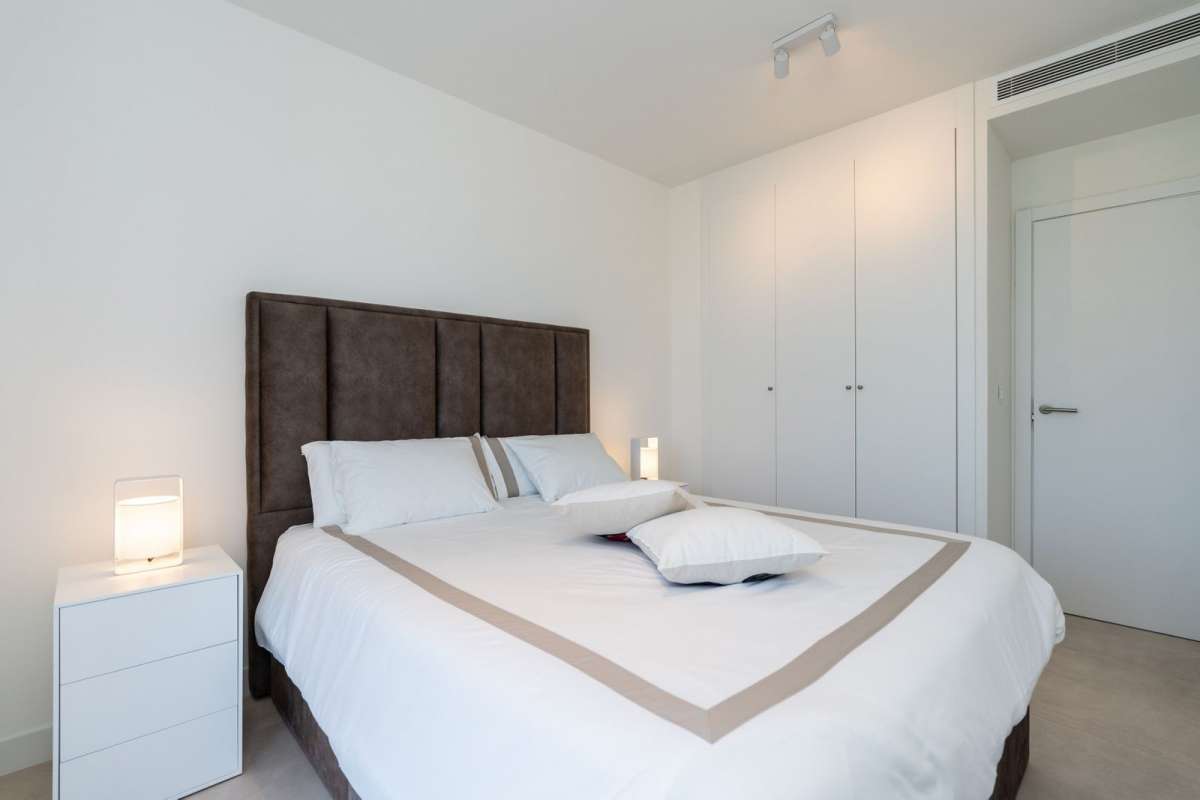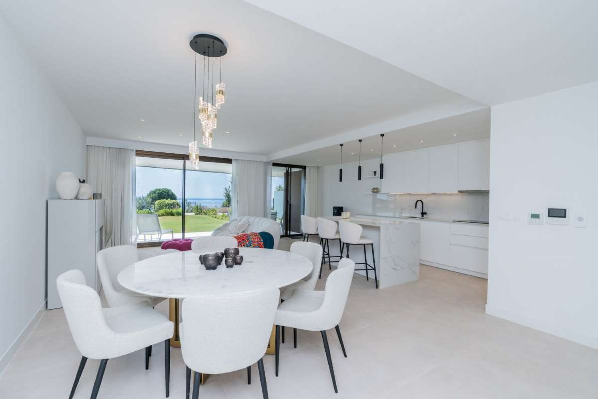 Stunning 3 bedroom 2 bathroom apartment with spectacular sea views in the prestigious new development of La Sabina, Camarate Golf. It is an elevated ground floor and its spacious and bright living-dining room with integrated modern kitchen with an island gives direct access to the incredible 45m2 terrace with covered and uncovered areas, plus a private garden of 240m2 perfect for relaxing moments or al fresco dining all year round. The master bedroom, also with direct access to the terrace, has an en-suite bathroom and large fitted wardrobes. The other two bedrooms share a bathroom and also have fitted wardrobes. The qualities of the apartment include air conditioning hot/cold, electric blinds amongst others, and there is a parking space and storage room included in the price.