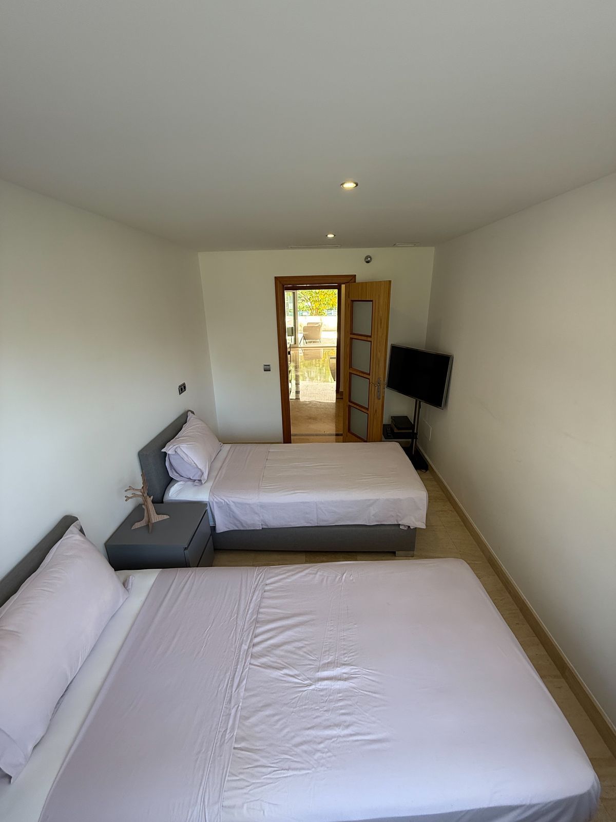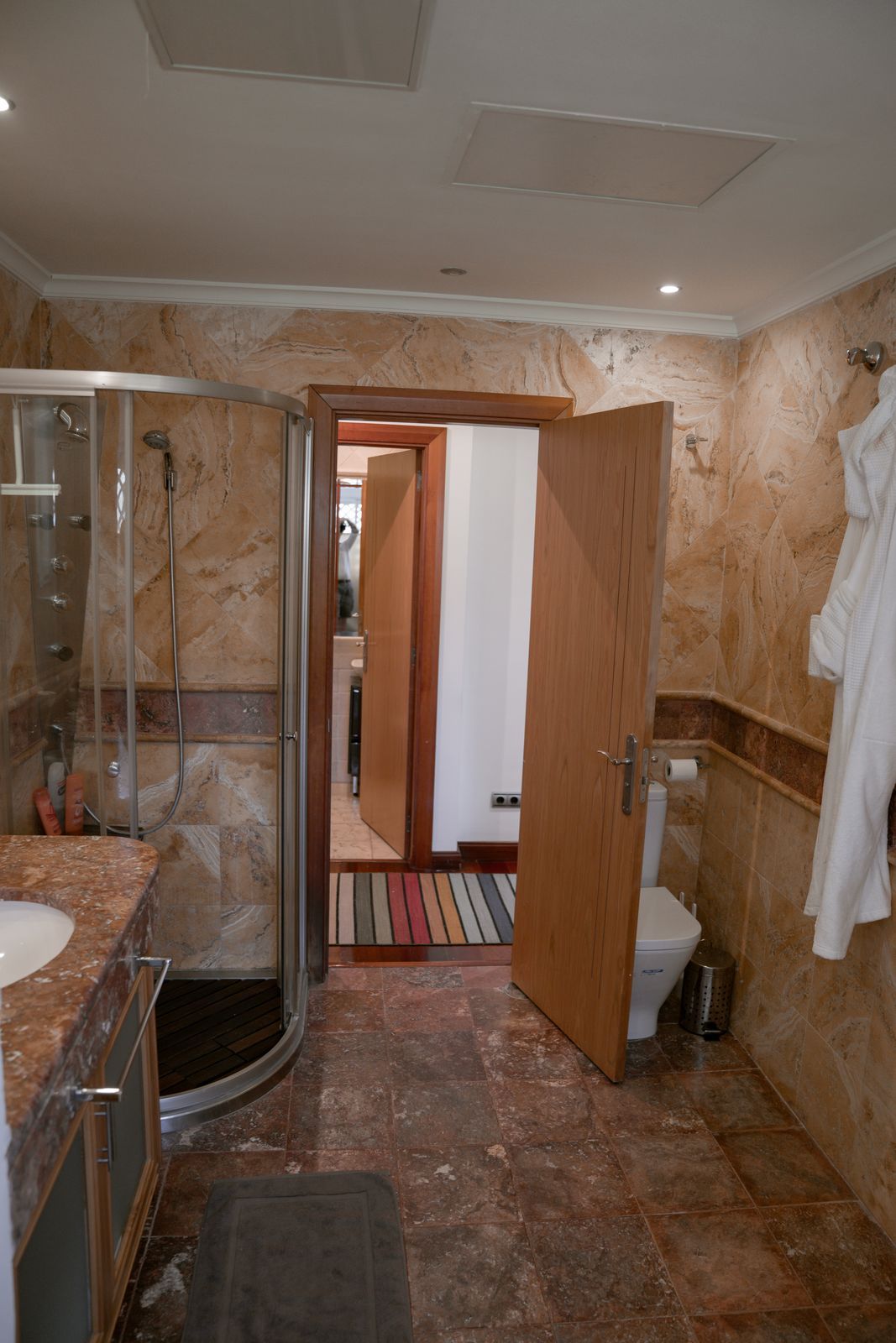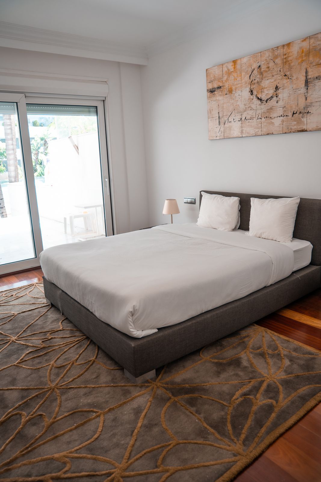 The property offers three bedrooms and three bathrooms. The master bedroom has an en-suite bathroom with a bathtub and shower and direct access to the terrace.