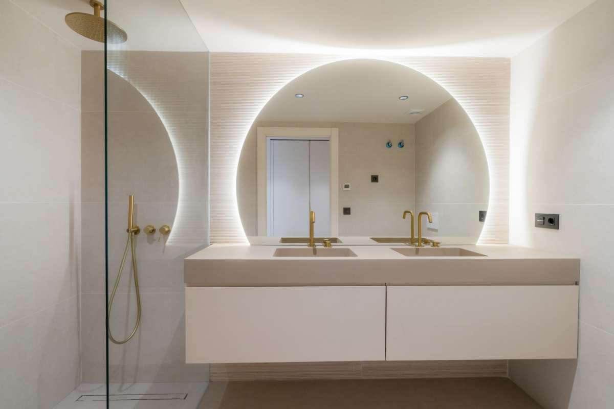 All three bedrooms feature bespoke built-in wardrobes, while each bathroom has been elegantly designed with top-quality porcelain tiles, Italian fixtures, and integrated lighting that enhances the home’s modern architecture.