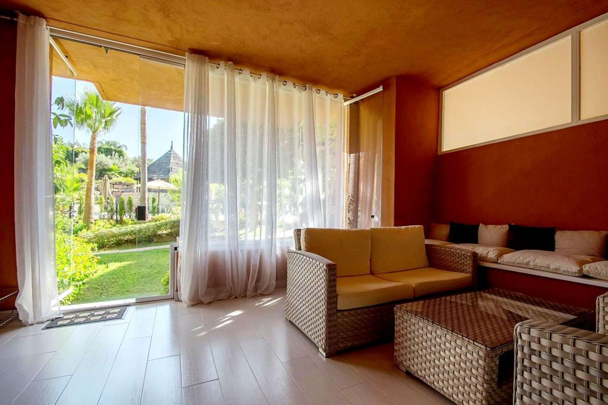 Exclusive ground floor apartment with view over the tropical gardens and communal pool area, in a quiet and picturesque complex in Nueva Andalucia de Marbella. Spacious apartment with a total area of 175m2 and includes 2 bedrooms, 2 bathrooms, terrace and garden of 55m2, underground parking places and a storage room. Have been designed and built from high quality materials. Situated In prestigious gated residential complex with 24 hours security, swimming pool, tropical gardens and a lake.
