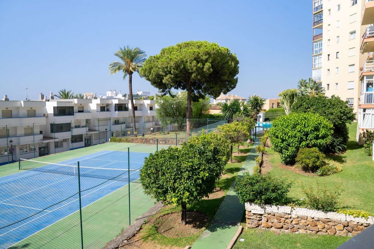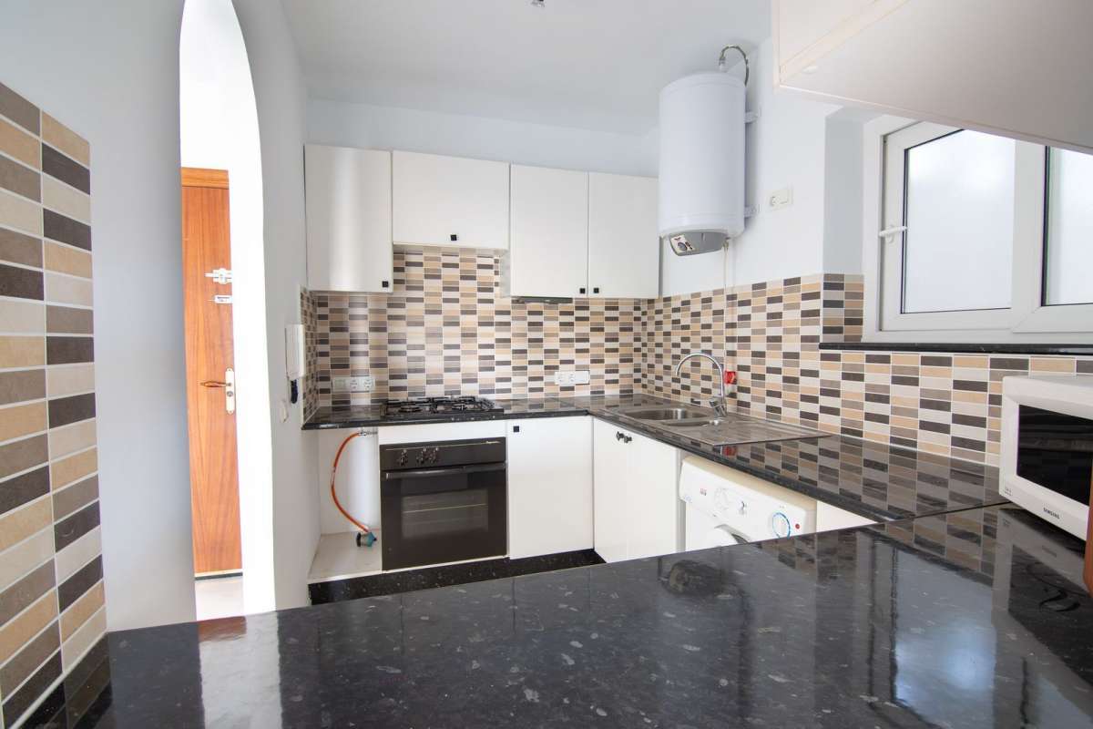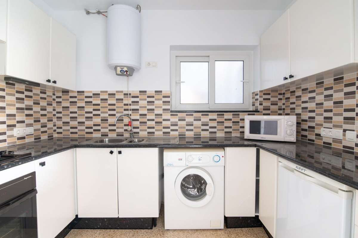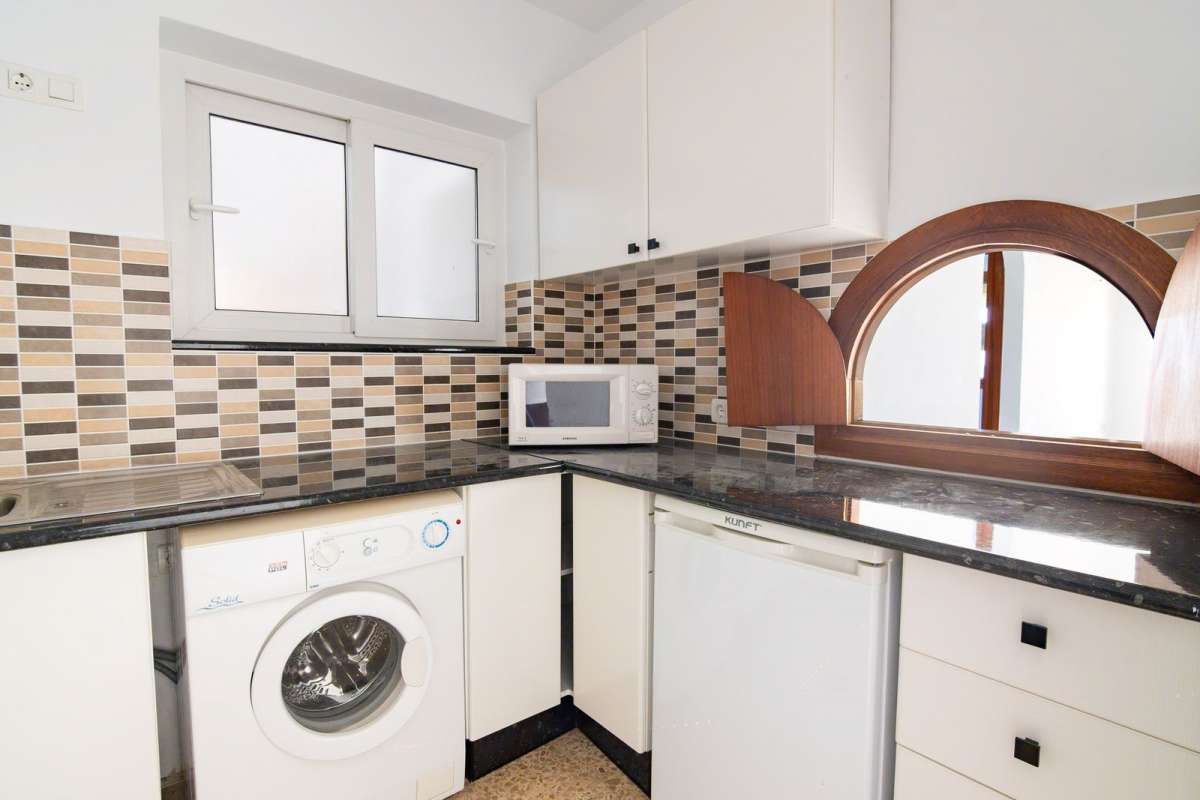 This first-floor apartment features a spacious, fully equipped kitchen and a bright south-facing living room with access to a sunny private terrace offering beautiful views of the community gardens and partial sea views. The perfect spot to enjoy at any time of the day.