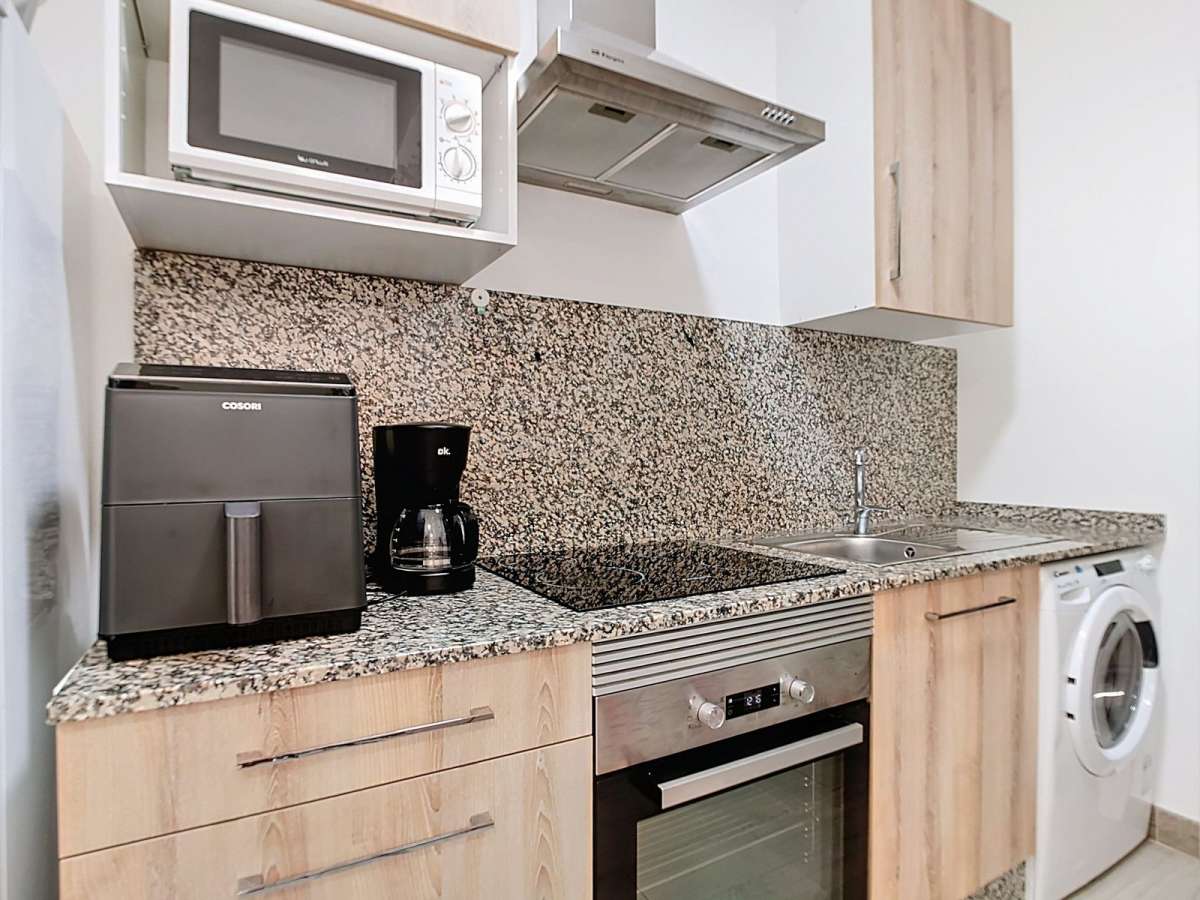 The apartment's design includes a spacious entrance, wooden floors, and painted walls that provide a modern and elegant touch. The kitchen is equipped with quality appliances, such as a refrigerator, oven, washing machine, and dishwasher, making your daily life easier. All apartments feature a master bedroom with a double bed and a desk, ideal for working from home.