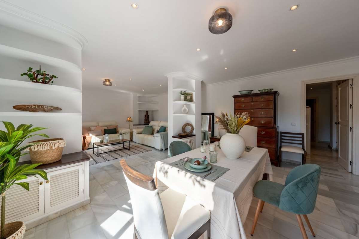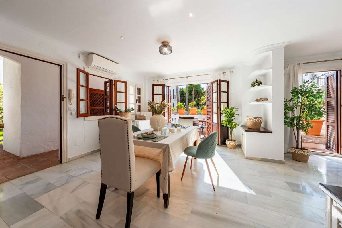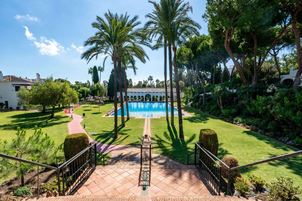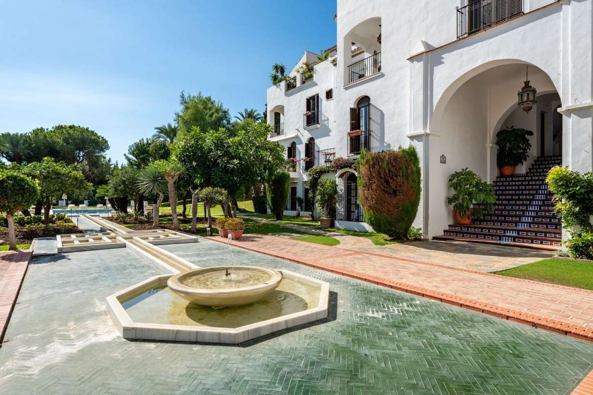 This property's unique advantage is that it holds a one of a kind position within the Urbanisation layout, based in the original first phase which is often often cited as the most beautiful of all. The terrace, as does the living room and dining area looks out upon the sweeping view of the Plaza, with its avenue of majestic, soaring palm trees and the Alhambra inspired fountains and water ways which lead to the acclimatised pool and beautiful surrounding greenery.