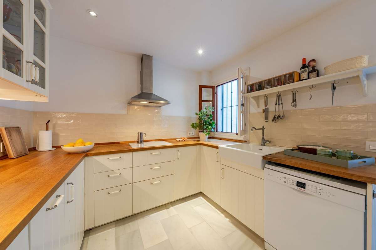 Another very desirable point is that it has two entrances, one facing the stairs that lead down to the principle entrance and the second, with a back terrace, which leads up to a small private parking area, which is highly convenient for unloading shopping.