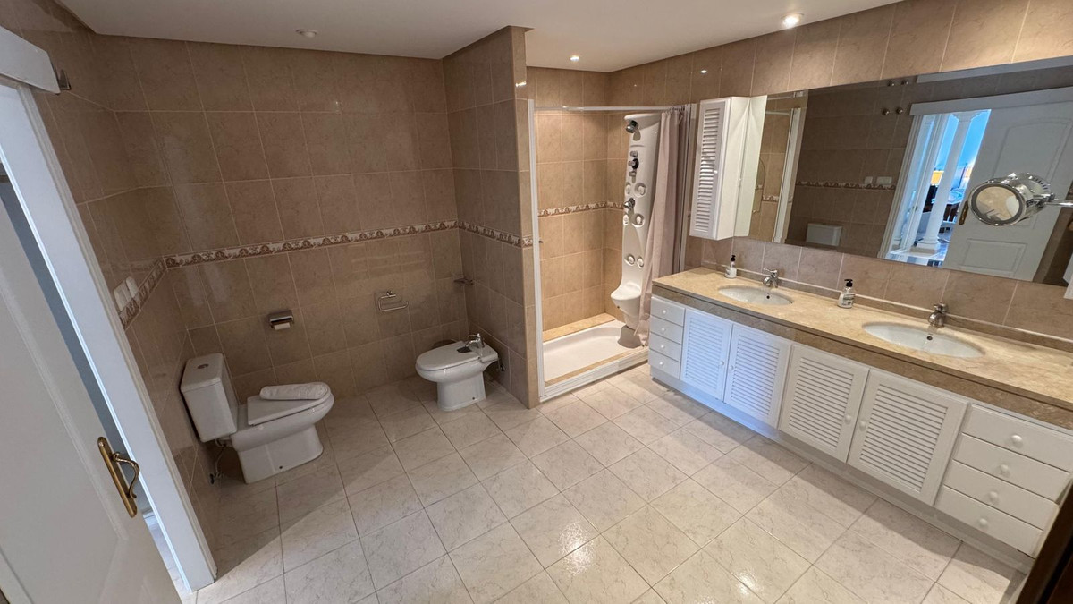 Suitable for a movie star, this three bedroom tastefully decorated apartment has been designed by the builder of this gated complex with three bedroom with plenty of living space. The property comprises: Entrance hall with guest cloakroom leading to an enormous lounge with dining area leading onto the terrace, very spacious fully fitted luxury kitchen, main bedroom suite with access to the terrace, fitted dressing area leading to a sumptuous bathroom with all round shower jets, jacuzzi bath and a purpose built sauna, two further double bedrooms both with en-suite bathrooms and guest toilet. Communal swimming pool for the use of this apartment and only four others.