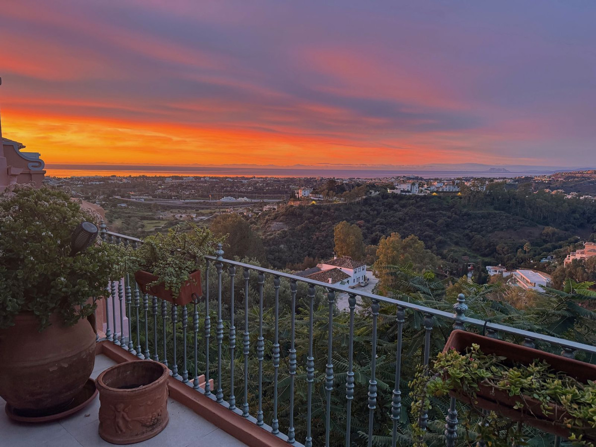 As you approach the entrance, you go up a few steps that lead to the front door. Upon entering, you’ll be greeted by a spacious and light-filled dining and living area, accentuated by floor-to-ceiling windows that create an inviting atmosphere. Step outside to your expansive 22m² covered terrace, which features glass curtains, allowing you to enjoy the stunning panoramic views of the area of Benahavís, the majestic nearby mountains, the iconic Rock of Gibraltar, and the sparkling sea. The beautiful open South-West views provide a sense of comfort all year round to the mind and soul; on clear days, you can even catch a glimpse of the African coast and the Atlas Mountains—truly breathtaking! The sunsets from here are spectacular.