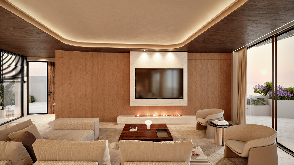 Spread over three floors, the home offers everything you would expect from a dream villa by the sea. It includes four en-suite bedrooms, an extra room for staff, seven bathrooms, a wine cellar, spa, gym, cinema, and a spacious living room with an open kitchen. Large glass sliding doors ensure a seamless transition between indoor and outdoor living, with direct access to the panoramic terrace and the infinity pool.