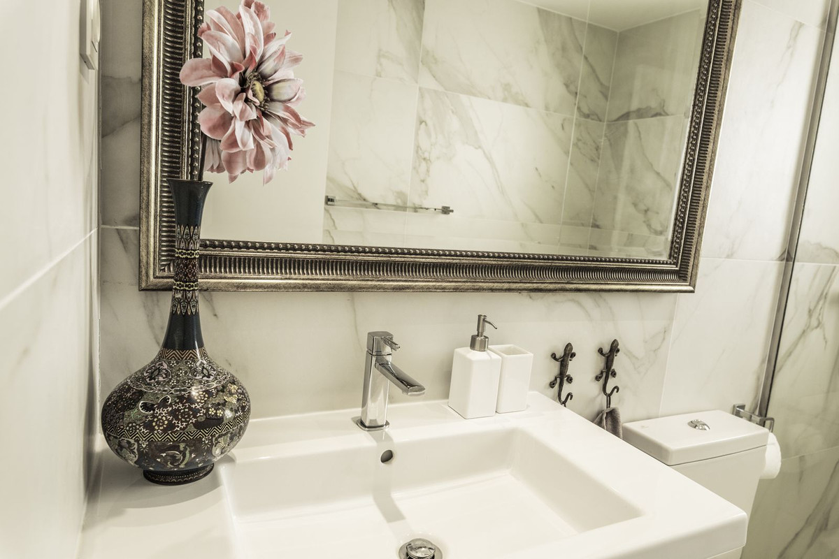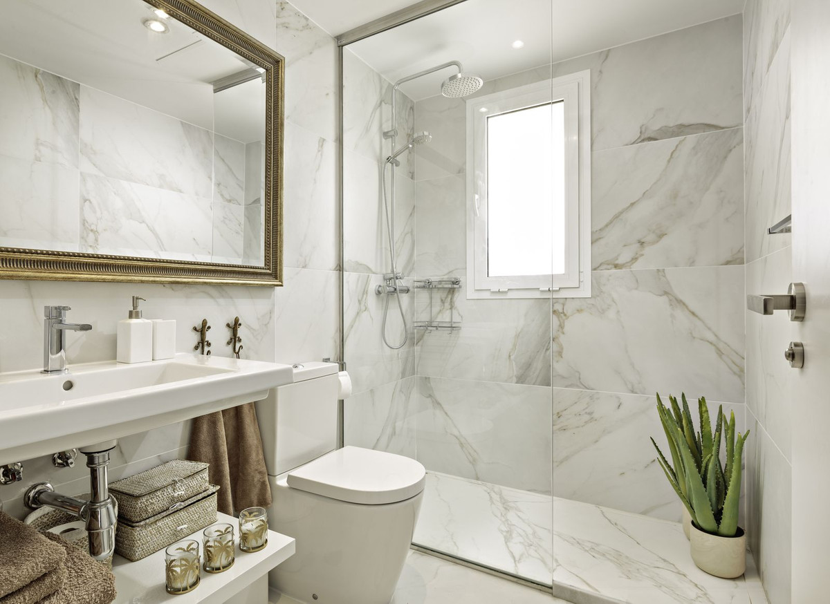 A semi-private elevator takes us to this fantastic penthouse. On the first level, we find a bright and spacious open-plan living area, with raised ceilings that give this particular apartment a feeling of openness as you walk in. This duplex has beautiful Porcelanosa flooring throughout, and a well-equipped kitchen that features a gorgeous quartzite countertop island, perfect for entertaining or enjoying a relaxing brunch. A pretty view of the hills can be enjoyed from the window over the sink. All ceiling lights throughout the house are energy-efficient and dimmable, for an easy change in ambiance depending on the occasion.