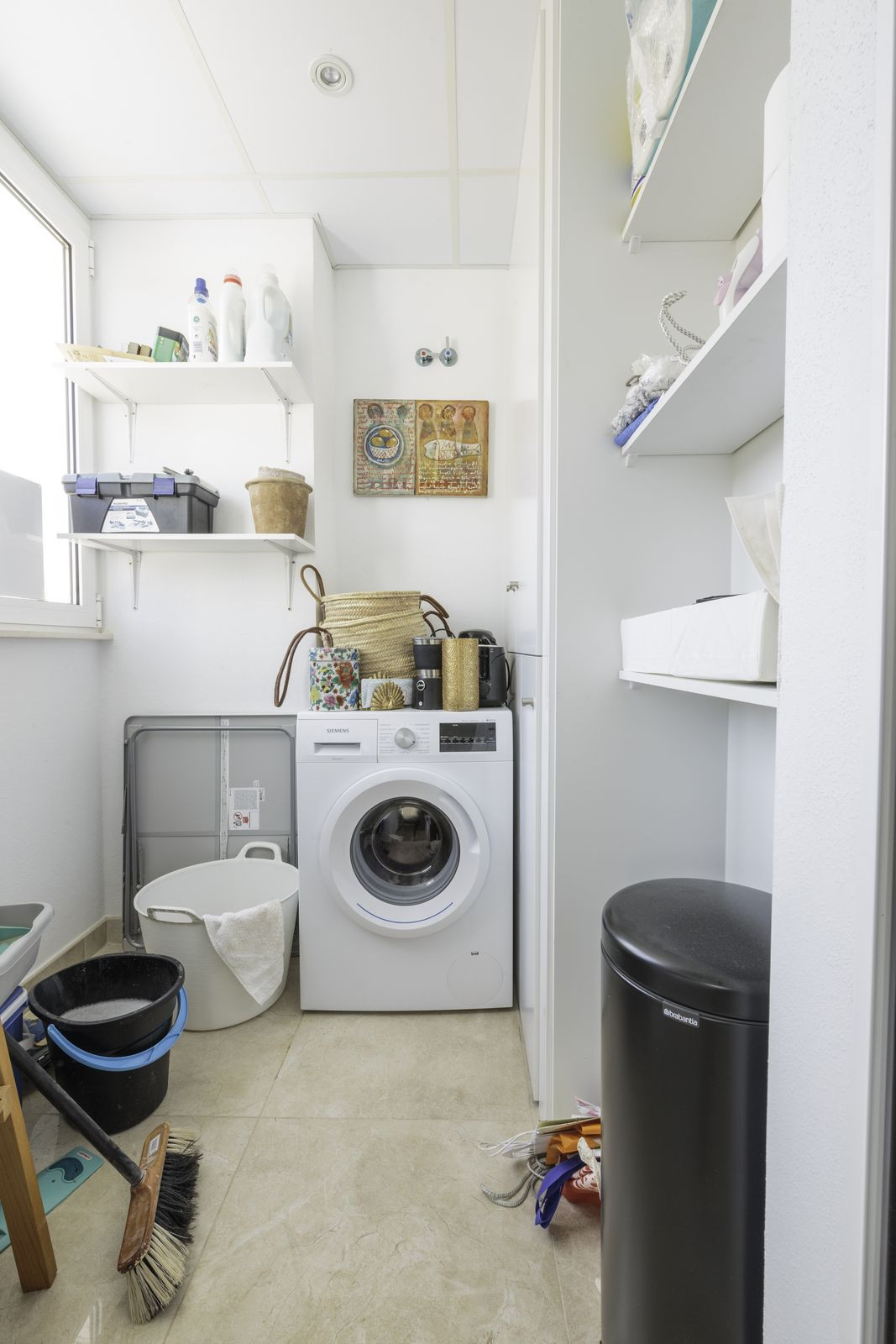 Back on the first floor, the laundry room is separated from the kitchen by a door, with space for storage (like a pantry), and a washing machine is located there. There is additional storage under the stairway. All appliances are top-tier brands (Siemens). The apartment features central cooling and heating air throughout the house, with independent thermostats in the living room and bedrooms, and heated flooring in the master bedroom and bathroom on the second floor.