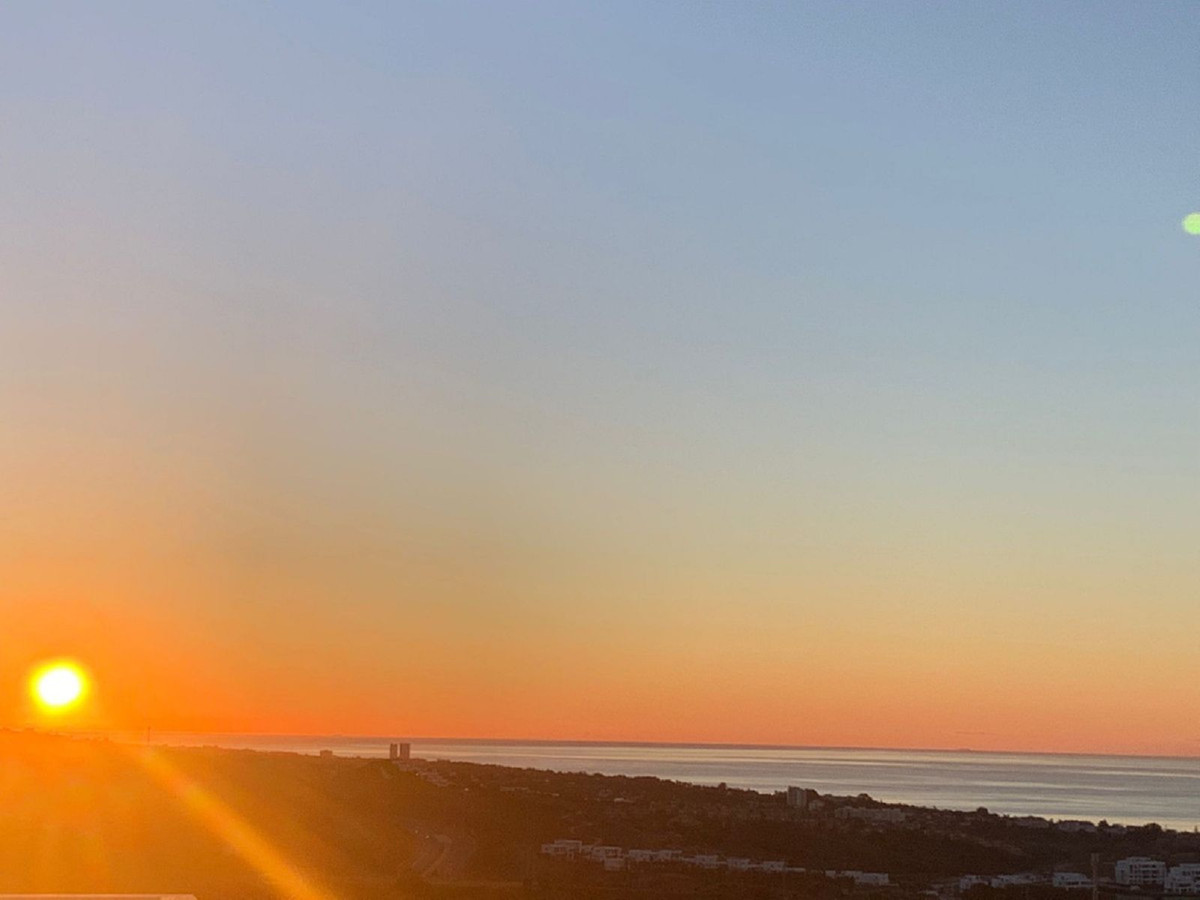 A sophisticated modern stairway with a large window (offering sea views) leads us upstairs to the master bedroom, a luxe and inviting space where one can enjoy spectacular views of the sea and coastline while lounging in bed. On a clear day, the outline of the African mountain range can be seen, along with Gibraltar and the nearby Sierra Blanca mountain range. The room comes with ample built-in closets. The ensuite bathroom is done in black slabs with white veining, which, juxtaposed with the white sink and cabinetry, makes it simply stunning!! On that same level, we find a large second terrace, ideal for sunbathing, as it is entirely private, where one can enjoy a snack at the high table and, undoubtedly, the incredible 360º views. It comes equipped with an outdoor shower, a nice addition for a quick refresh while enjoying the summer sun.