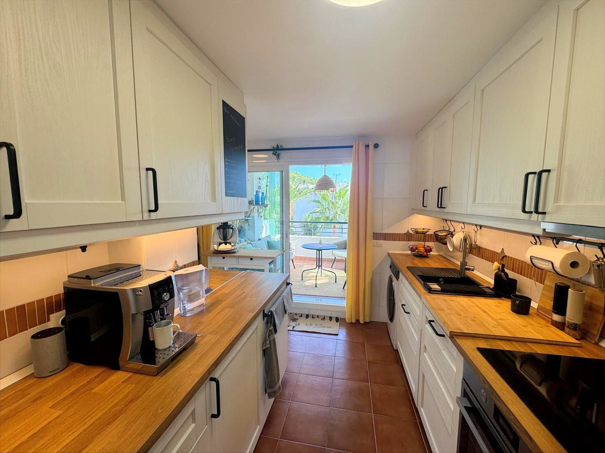To your left, a recently refurbished, fully equipped kitchen features modern fittings and a new water boiler. From here, step out onto a charming covered terrace — a peaceful spot for morning coffee under the soft sun, with uninterrupted views of mature greenery and the fairways of Alhaurín Golf. Sheltered from the intense afternoon heat, it’s also an inviting retreat for summer relaxation.