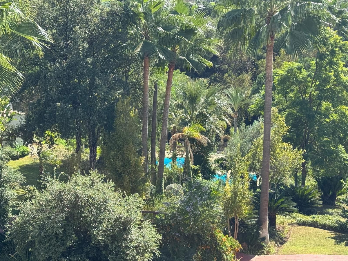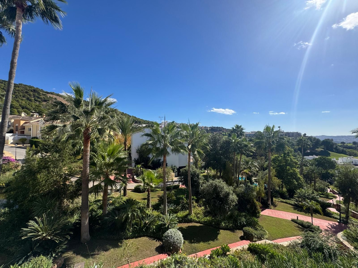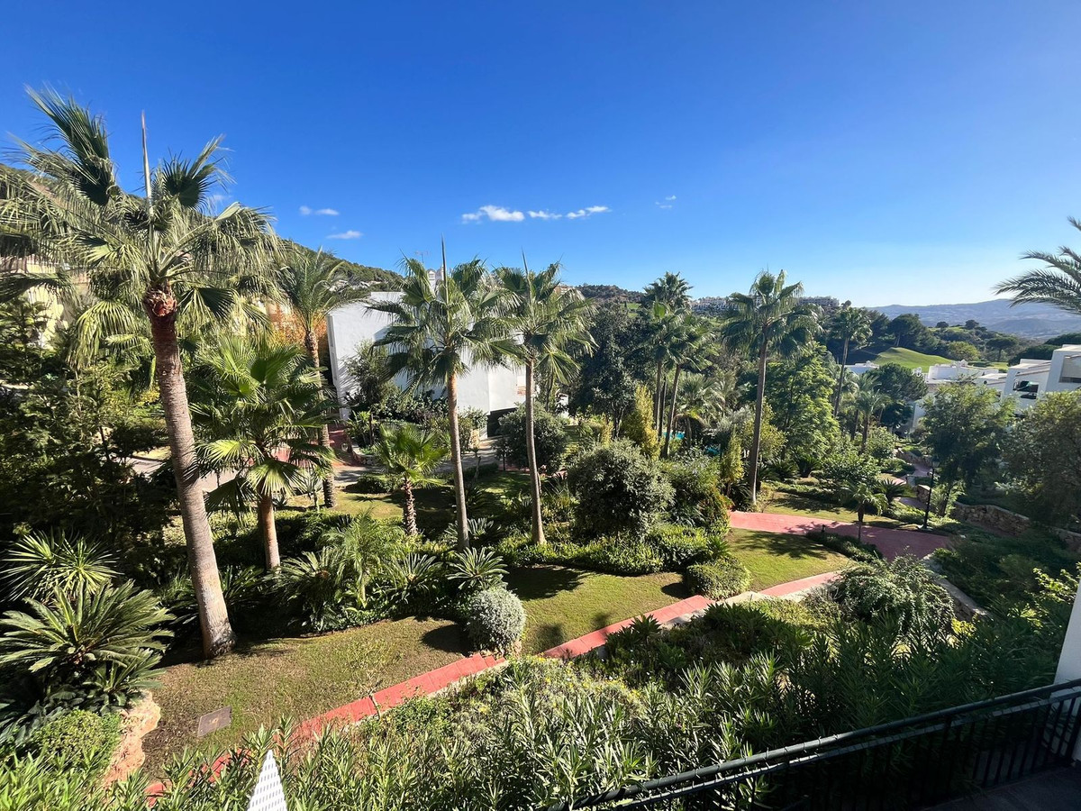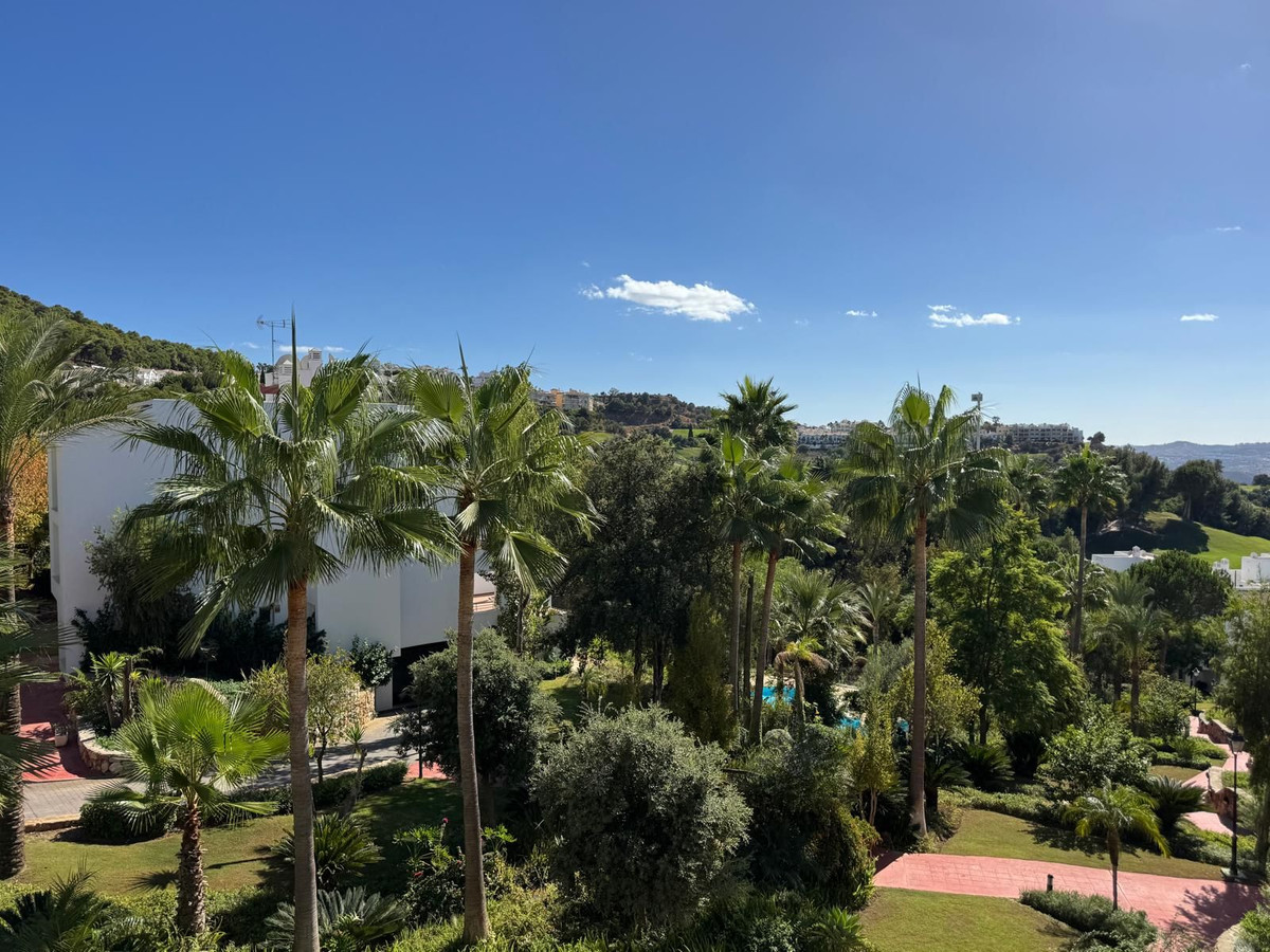 This beautifully maintained first-floor apartment offers charming views over mature, tropical gardens, Alhaurín Golf, and the hillside beyond. Accessible via both stairs and lift, the home welcomes you with a spacious entrance hall that sets the tone for its comfortable and thoughtful layout.