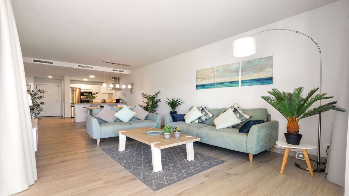 The property features two comfortable double bedrooms with fitted wardrobes and two generous bathrooms, one of which is en-suite. Every detail has been carefully maintained, making the apartment move-in ready. Modern comforts include air conditioning, electric blinds, and solar panels that add an eco-friendly touch. A private parking space and storage room are also included.