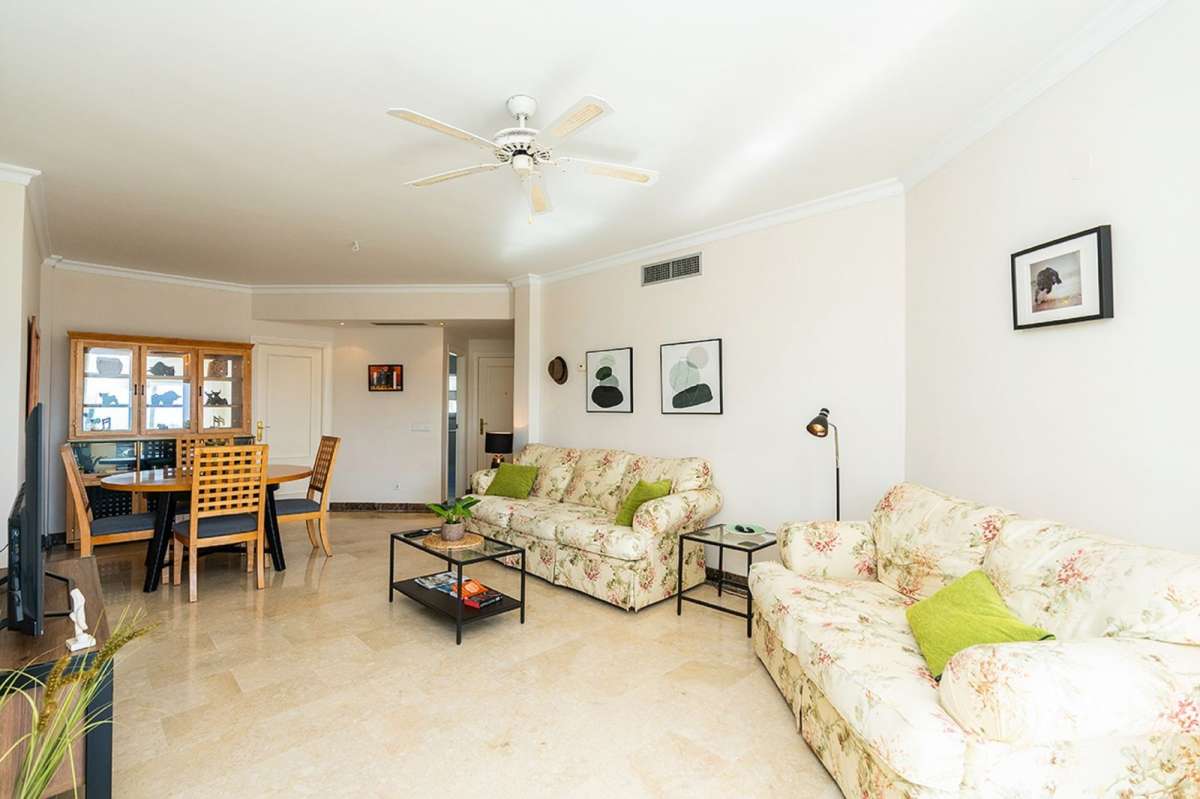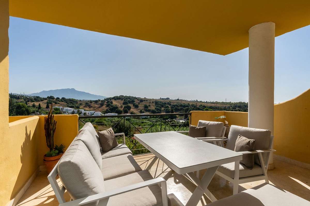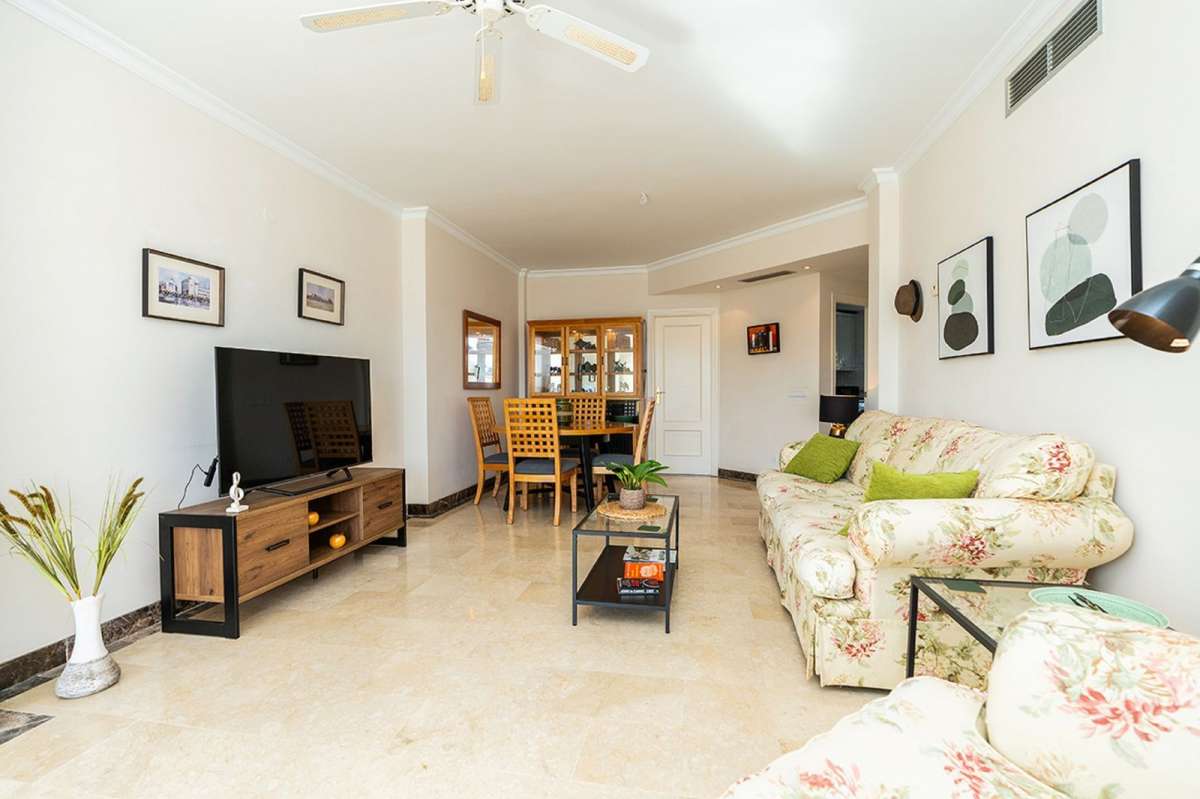 The entrance leads into a large, sun-filled living-dining area with direct access to a private terrace boasting panoramic views of La Concha Mountain, landscaped gardens, and lateral sea views. The property features a separate, fully fitted kitchen equipped with high-end appliances.