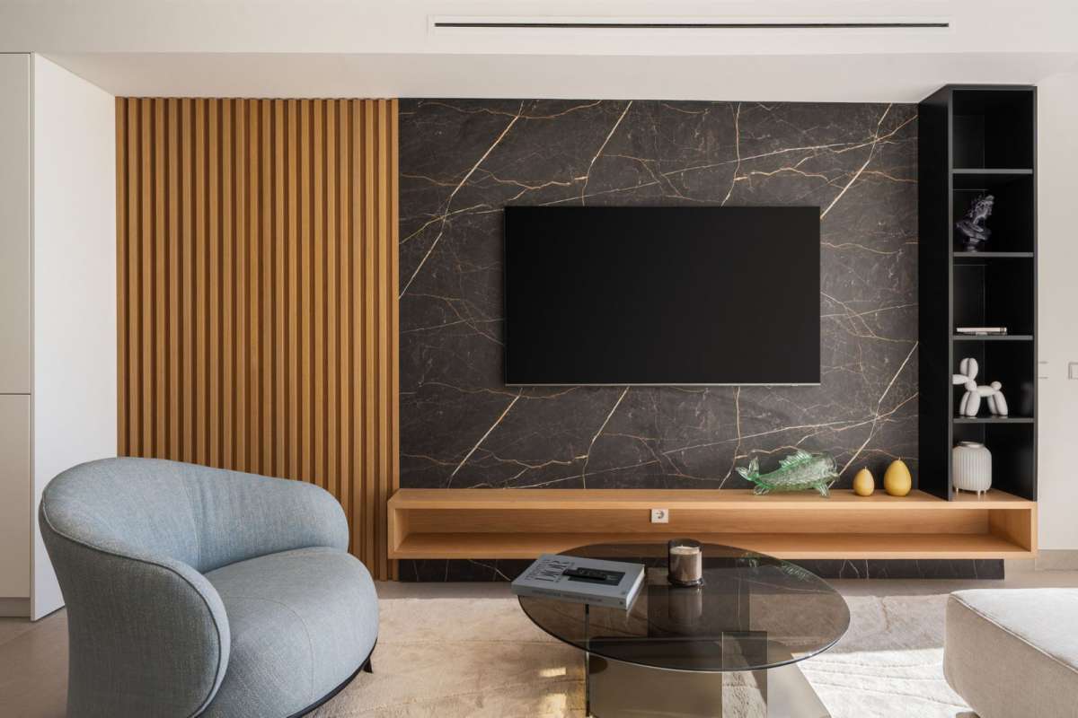 Inside, the apartment has been designed for both style and functionality. The three spacious bedrooms provide privacy and comfort, with two featuring en-suite bathrooms, complemented by an additional bathroom and guest toilet. Large windows ensure every room is filled with natural light, enhancing the modern décor. Furniture is by Natuzzi, and Cavalli wallpaper adds a touch of designer sophistication. The open-plan kitchen, fitted with Siemens appliances, flows seamlessly into the living and dining area, creating a space ideal for family life and entertaining. A smart home system enhances everyday convenience and control. Direct elevator access to the apartment adds exclusivity, while ample storage solutions keep the interiors uncluttered and practical.