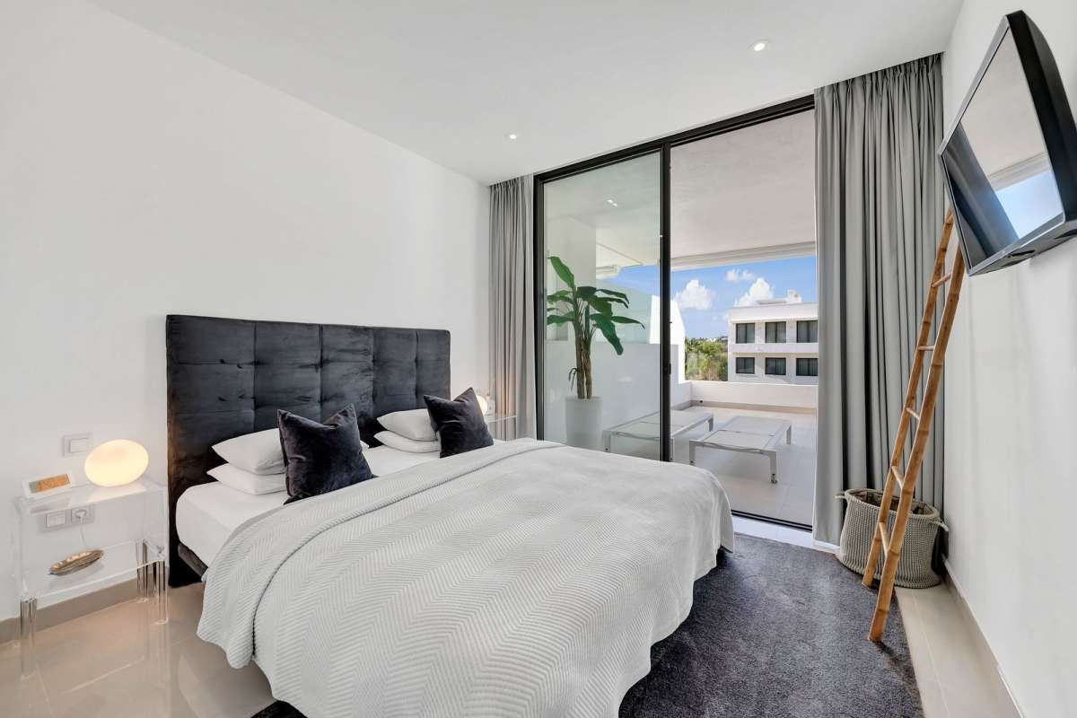 The master suite features an en-suite bathroom, built-in wardrobes, and direct access to the terrace. The second double bedroom also opens onto the terrace, ensuring natural light and privacy throughout.