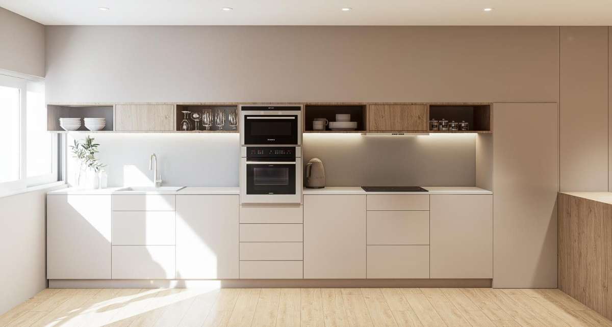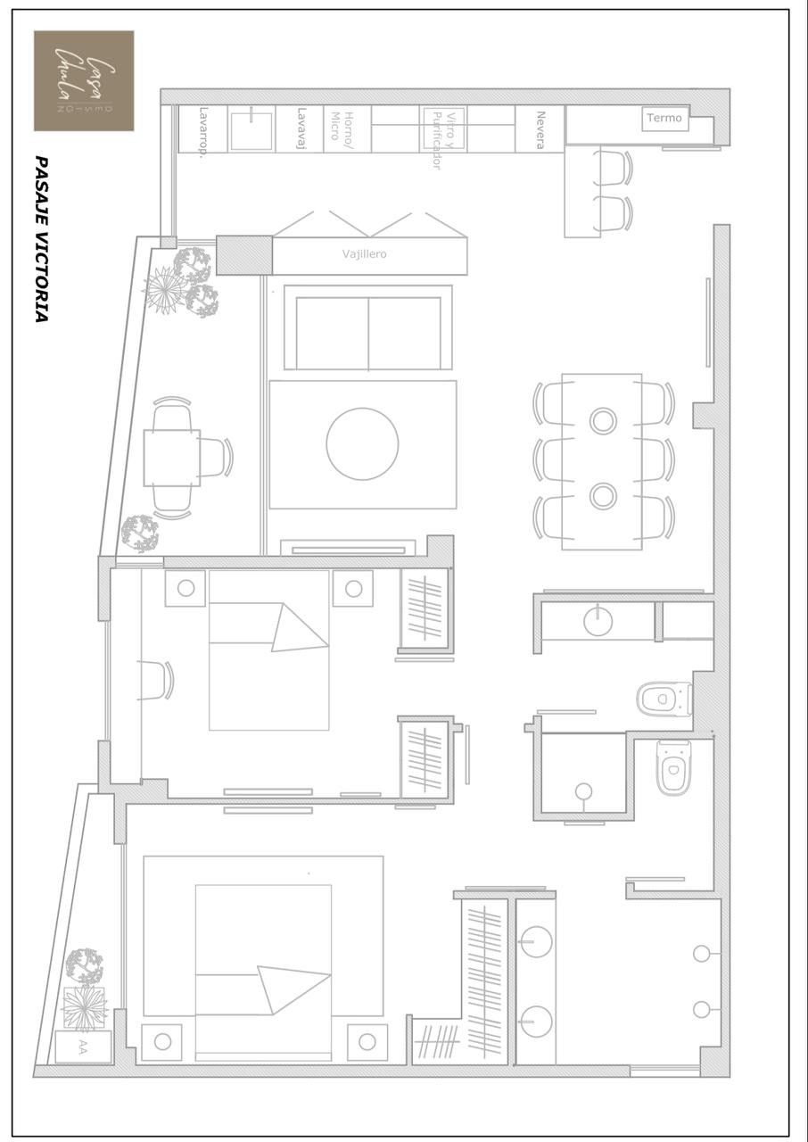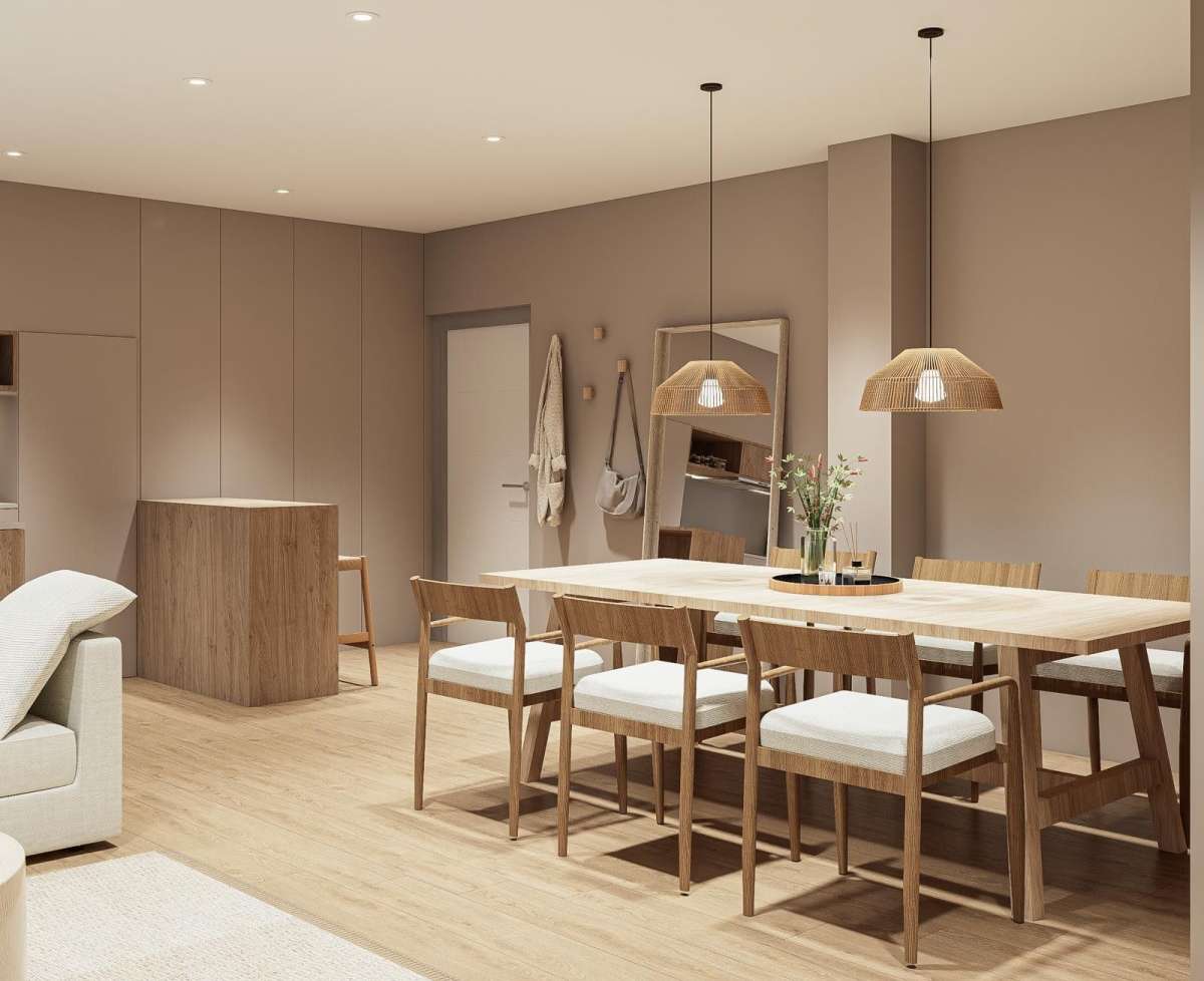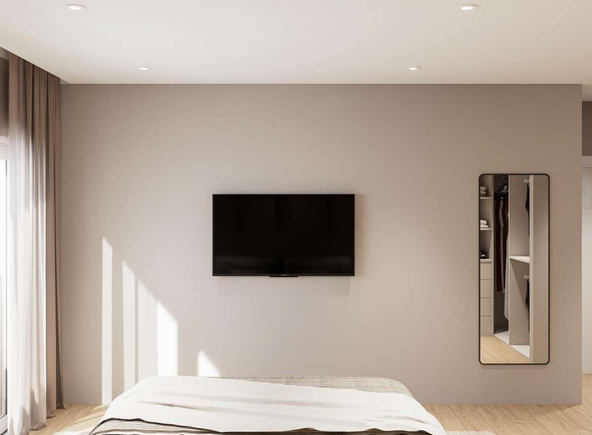 The apartment features two bedrooms, both with built-in wardrobes and modern finishes. The master bedroom has a large private bathroom with a spacious shower, while the second bathroom is also fully equipped and maintains the same contemporary design. Finishes include porcelain flooring in wet areas and double glazing on all windows, ensuring comfort and efficiency.
