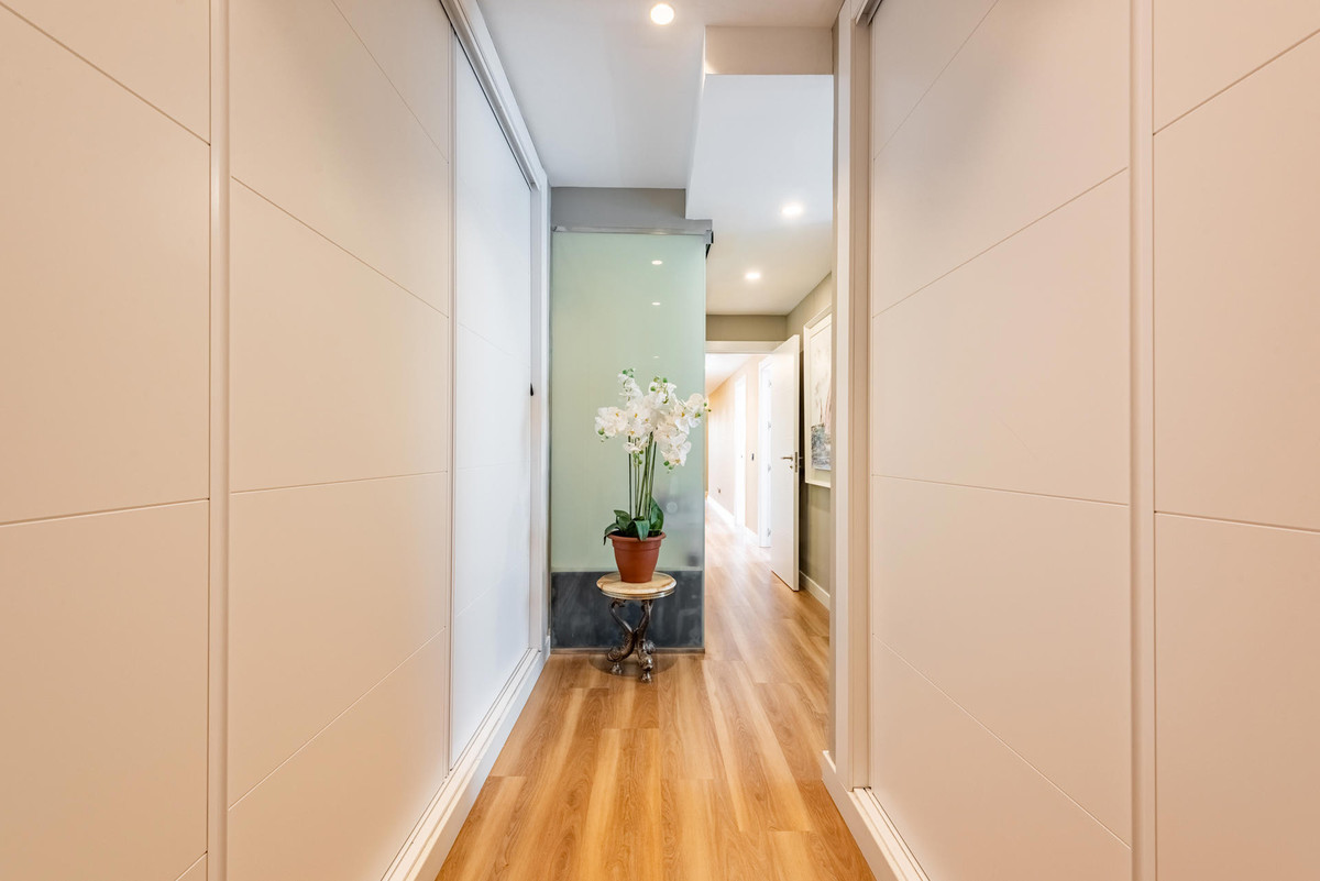 Bathed in natural light, the apartment features two terraces facing south and east, allowing you to enjoy the sun from morning to afternoon while overlooking the tranquil pool area, a true urban oasis that evokes a resort-like ambiance in the middle of town. The open-plan layout seamlessly connects the spacious living room with the modern kitchen, creating a bright and sociable atmosphere. With four bedrooms and three bathrooms, there is ample space for both family and guests, all designed in a clean, contemporary style.
