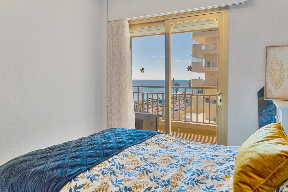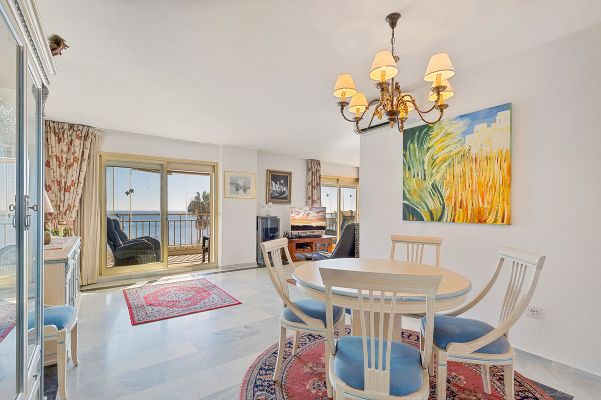 Front-line corner apartment in the western part of Fuengirola. The lovely south-west location allows you to enjoy the sun all day on the 47 m2 large terrace. The apartment is on the third floor and has a fantastic view of the sea and the promenade. Right outside the door there are several nice cafes and restaurants. About 15 minutes walk to the church square in Fuengirola and 10 minutes walk from the shopping center Miramar. The apartment welcomes you with an entrance hall, a fully equipped kitchen and utility room, a spacious living room with access to the terrace in two directions, and three bedrooms and two bathrooms with showers. All three bedrooms have access to the terrace in the southwest and built-in wardrobes. There is also extra wardrobe space in the inner hall. The part of the terrace facing south has glass curtains and makes an extra living room with fantastic sea views. All bedrooms and lounge have air condition. The apartment has been reformed continuously over the years and is in good condition.